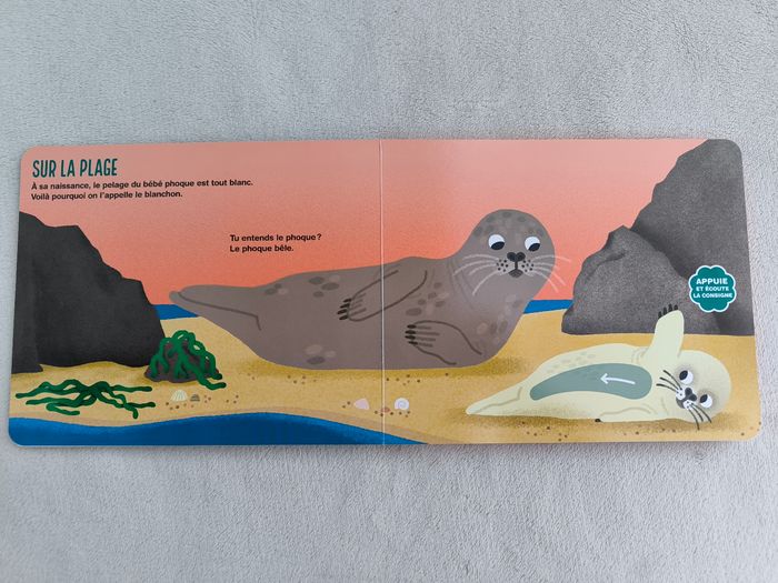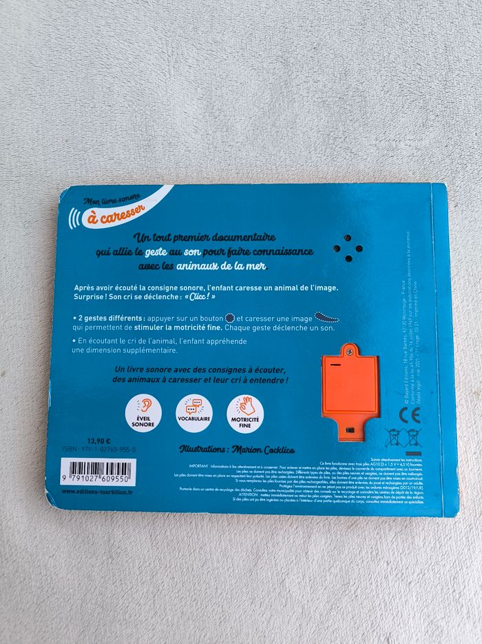 Livre documentaire sonore Mon livre sonore à caresser : Les animaux de la mer Éditions Tourbillon • Pages cartonnées • Appuyer sur un bouton, caresser une image -> À la surface : dauphin -> Sur la falaise : macareux -> Sur la plage : phoque -> Dans les rochers : goéland -> Sous l'océan : orque • Intérieur du livre en très bon état • Coins abîmés Fonctionne Piles non incluses En très bon état #evelyne_livres