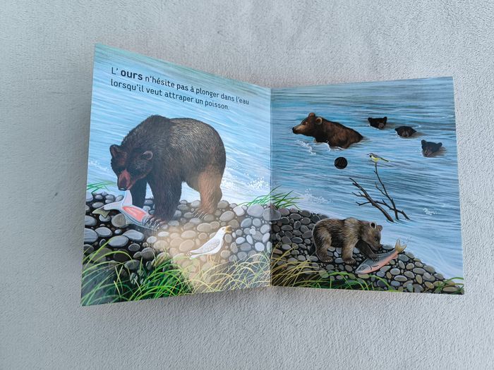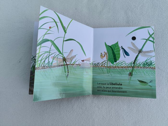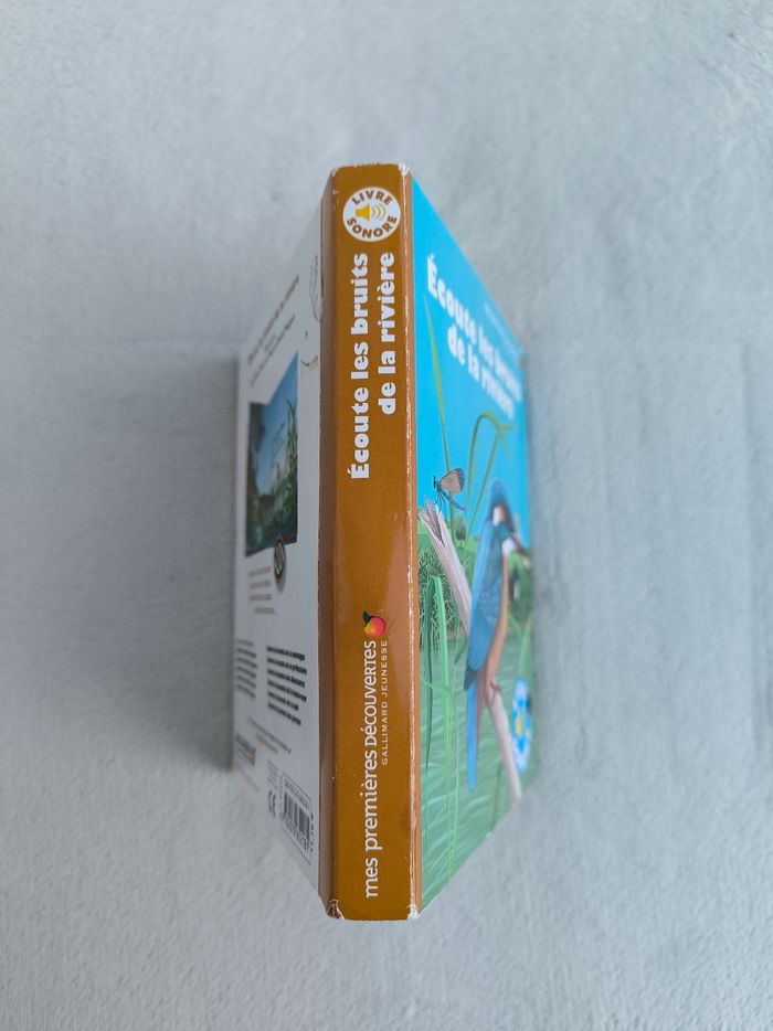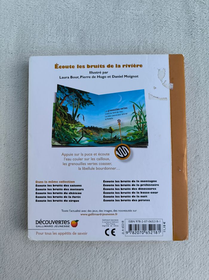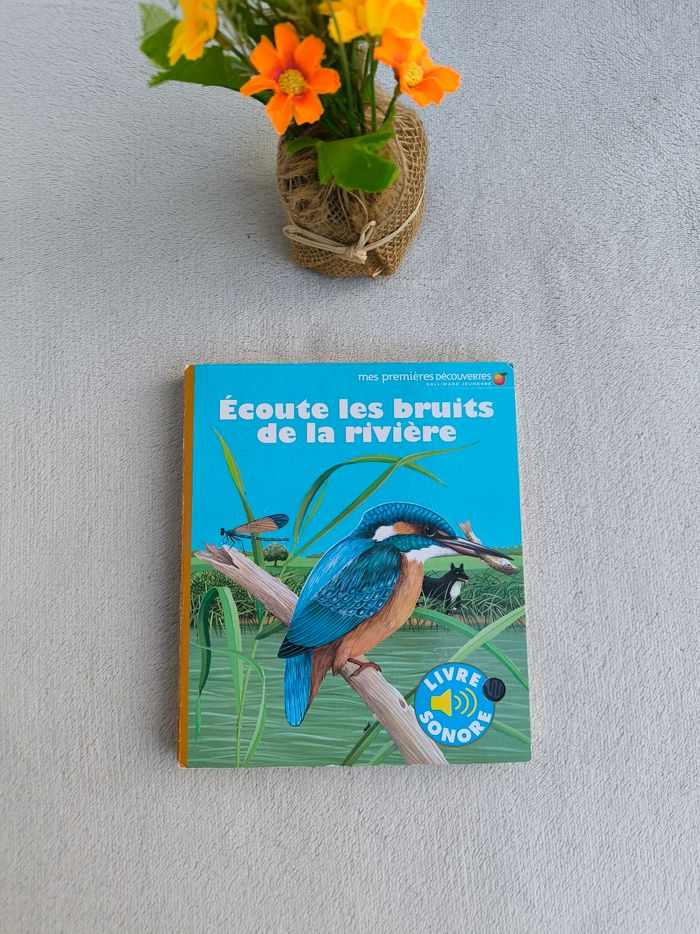 Livre sonore Mes premières découvertes : Écoute les bruits de la rivière Éditions Gallimard Jeunesse • Pages cartonnées -> L'eau qui coule, grenouilles vertes, poule d'eau, loutre, libellule, ours • Cherche et trouve • Intérieur du livre en très bon état • Coins abîmés • Intérieur piles légèrement oxydé Fonctionne Piles non incluses En très bon état #evelyne_livres