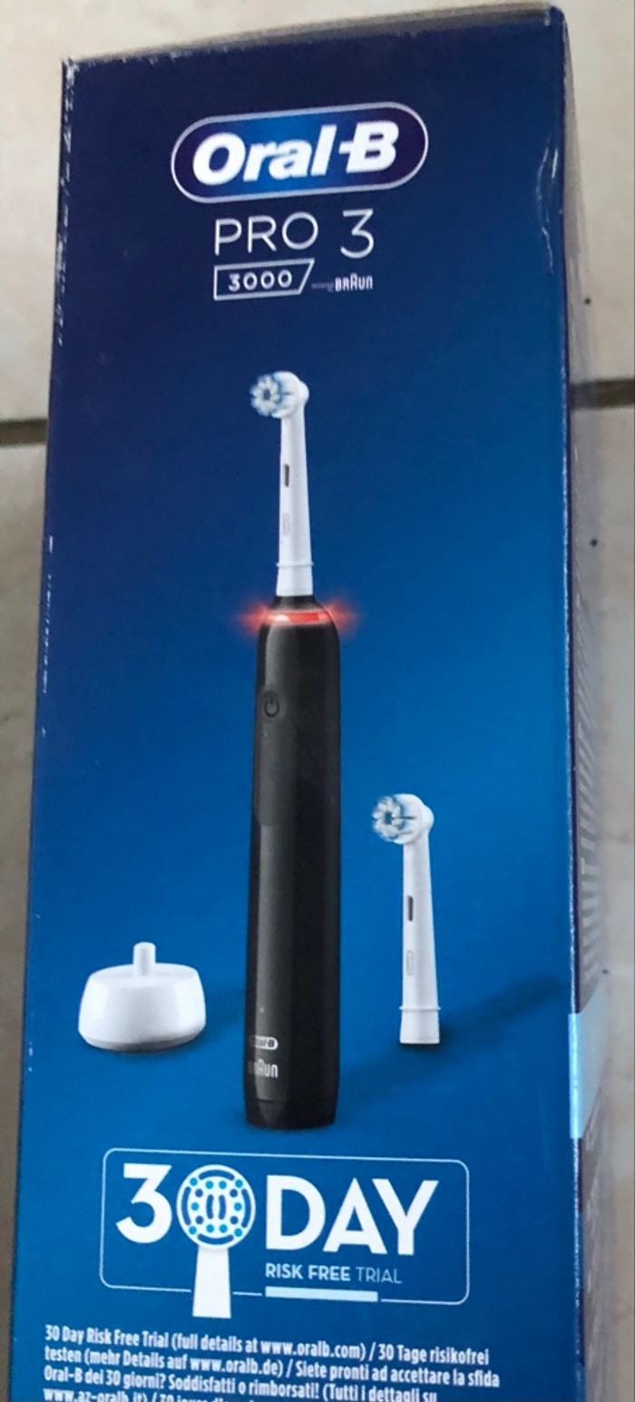 Brosse à dents Oral-b pro 3000 sensitive clean+ 2 recharges neufs dans emballage Neuve jamais déballé Découvrez la brosse à dents Oral-B Pro Series 3, par la marque la plus utilisée par les dentistes eux-mêmes dans le monde. La brosse à dents électrique Series 3 vous permet de respecter les recommandations de votre dentiste : elle vous aide à vous brosser les dents pendant 2 minutes grâce à son minuteur professionnel et émet un signal toutes les 30 secondes pour que vous pensiez à changer de zone de brossage. Contentez-vous de déplacer la brosse dans votre bouche : la brossette ronde unique d'Oral-B s'occupe du reste. Elle élimine jusqu'à 100 % de plaque dentaire en plus par rapport à une brosse à dents manuelle ordinaire, pour vous offrir des gencives plus saines. Elle rend votre sourire plus blanc dès le premier jour de brossage, en éliminant les taches en surface