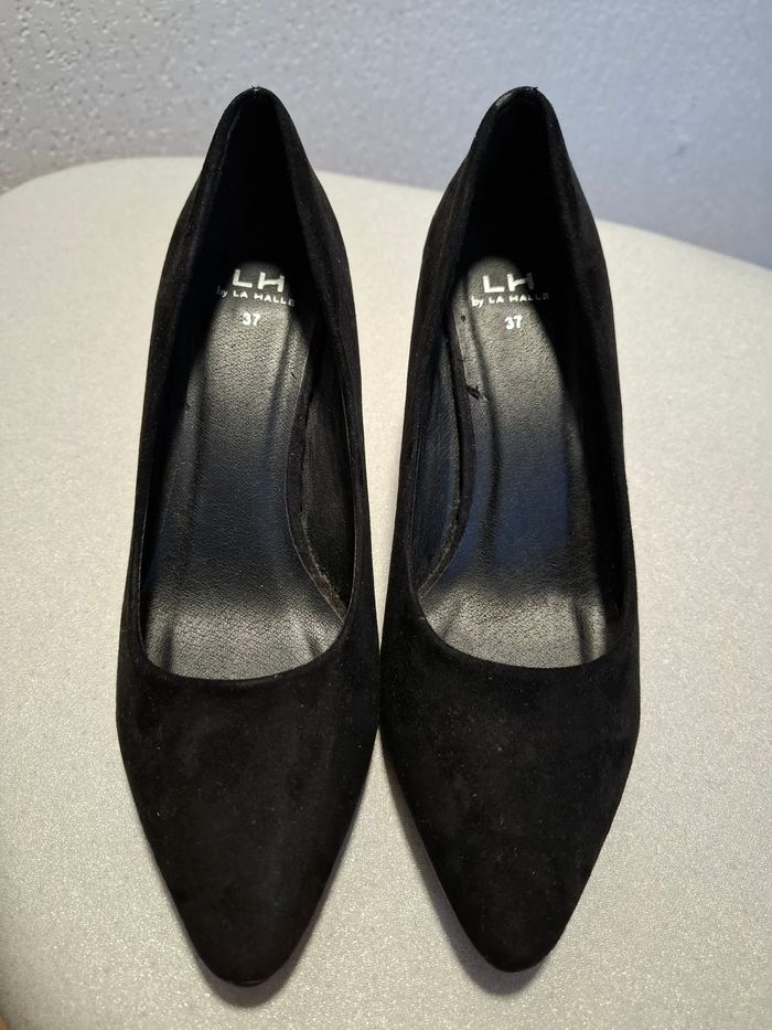 Jolis escarpins pour femme, marque LA HALLE, taille 37, en daim noir, à talons fins de 7 cm, et véritablement comme neufs, portés une heure .. Achetés 24,99 €