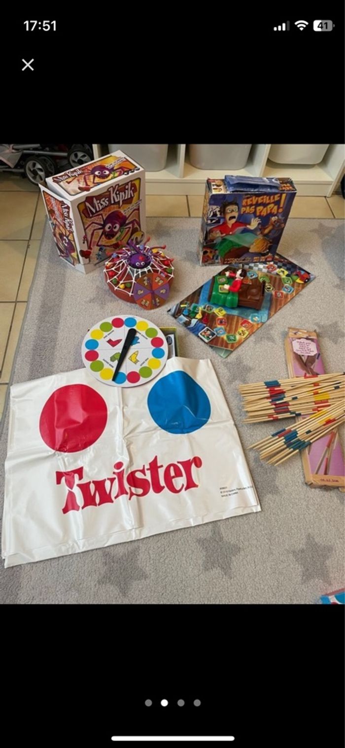 Vend ce lot de jeux pour enfants: Réveil pas papa, Miss Kipik Le Twister, et un mikado géant plus de 40 cm Les 4 jeux sont complets et avec des piles fonctionnelles pour ceux qui en ont.