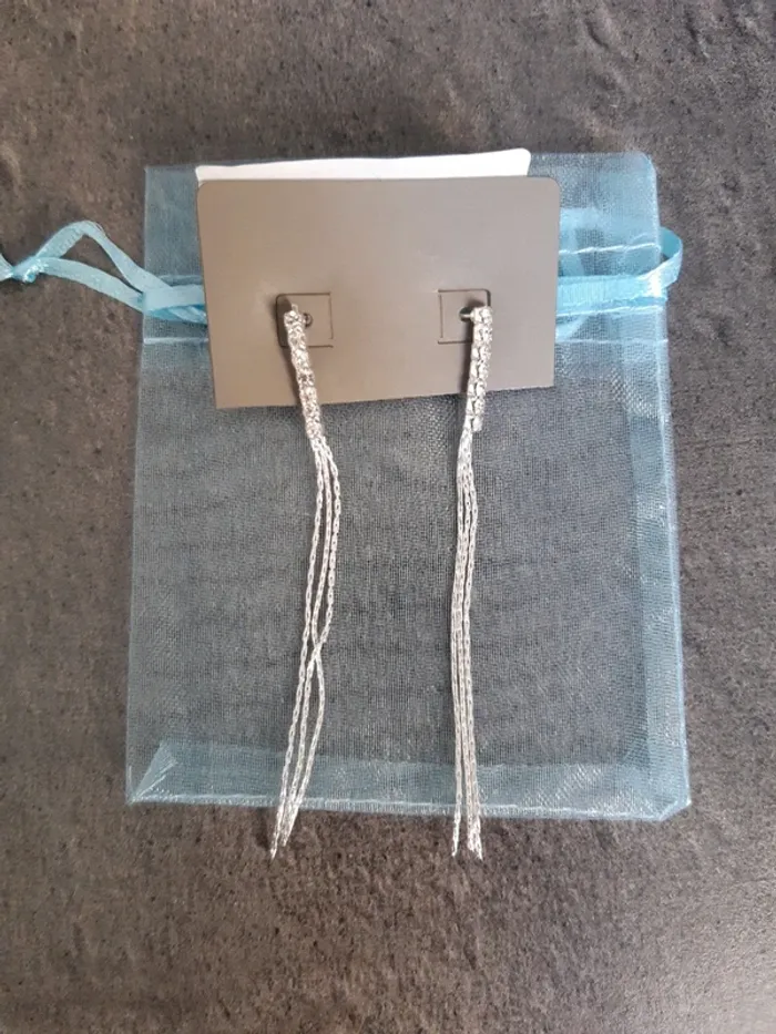 Boucle d'oreilles neuves, gris argenté, longueur 8 cm, avec un petit sachet en organza bleu