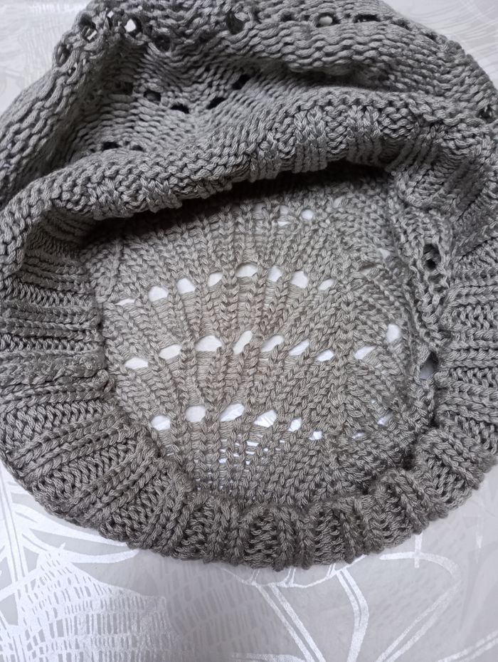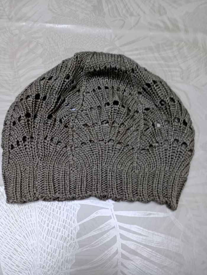Bonnet gris au crochet. Largeur posé à plat : 24 cm. Taille unique. Marque : H&M. Très bon état.