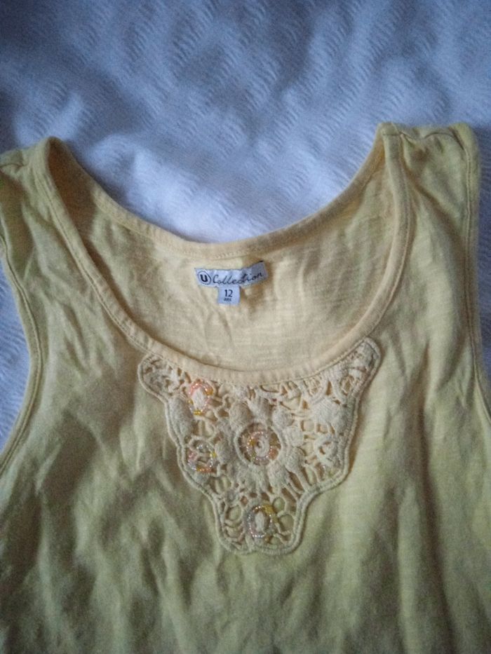 Bonjour je vends un beau débardeur couleur jaune le col est orné de perles parfait avec un jean.