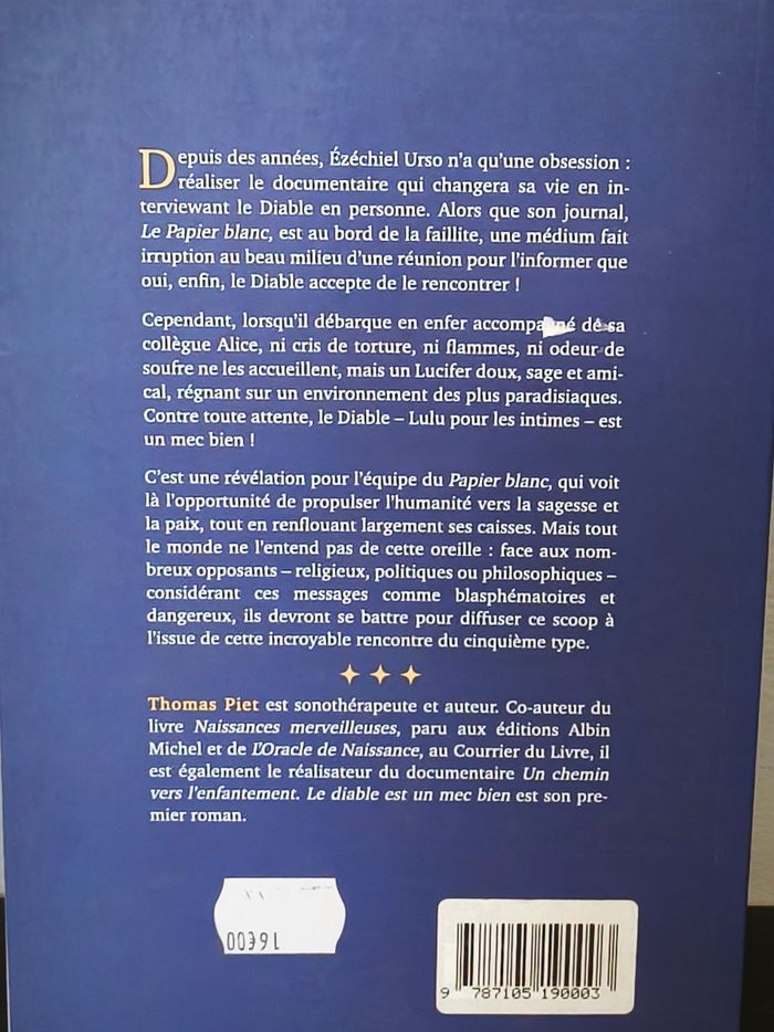 NEUF Roman "Le diable est un mec bien". C'est un exemplaire de service de presse (ou « galop d'essai »), envoyé aux journalistes ou aux libraires avant la sortie officielle pour promotion. ​L'histoire : C'est un roman fantastique/humoristique où un journaliste obtient enfin une interview avec le Diable, pour découvrir que l'Enfer ressemble plus à un paradis et que Lucifer est, contre toute attente, quelqu'un de très fréquentable.