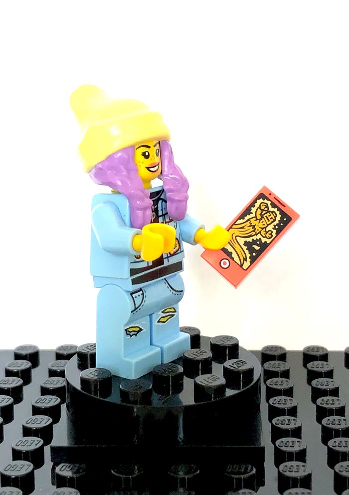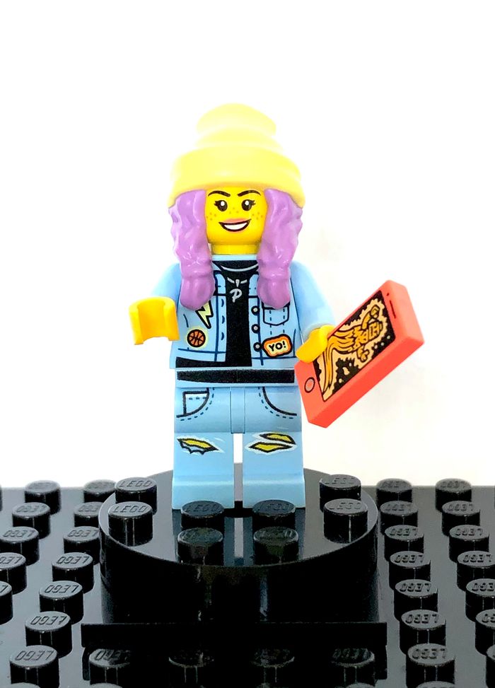 Figurine LEGO Hidden Side - Parker L. Jackson, denim jacket Tirée du set 40336 : Newbury Juice Bar Référence : hs011 En excellent état, comme neuve Complète avec accessoire d'origine