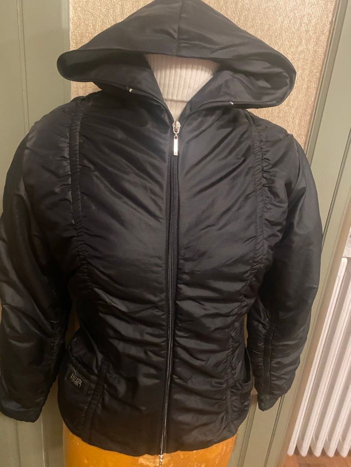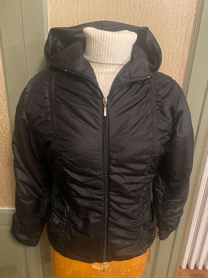 Beau blouson matelassé doublé Marqué Angora noir à capuche non amovible Fermeture zippée devant 58 cl Longueur manches à partir de l’épaule 59 cm Carrure dos 44 cm - hauteur dos 54 cm 2 poches ouvertes devant 65% polyamide 15% polyester Marqué 38 mais taille petit très près du corps taille plutôt 36