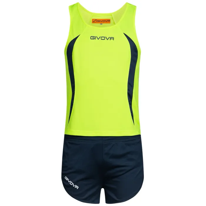 Marque: Givova Matériel: 100% polyester Logo de la marque imprimé au centre de la poitrine et sur le cou Logo de la marque imprimé sur la jambe droite Sans manches matière respirante dos allongé matériau supérieur léger et respirant Ensemble composé de Maillot et Short ceinture élastique avec cordon de serrage Maille à l'intérieur