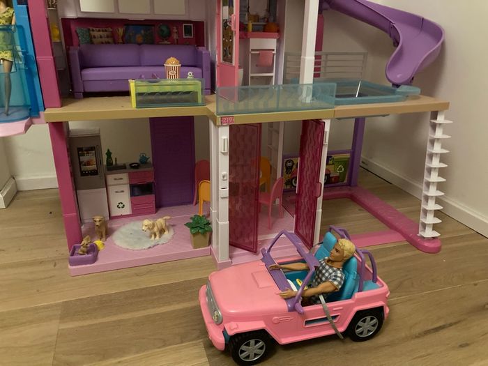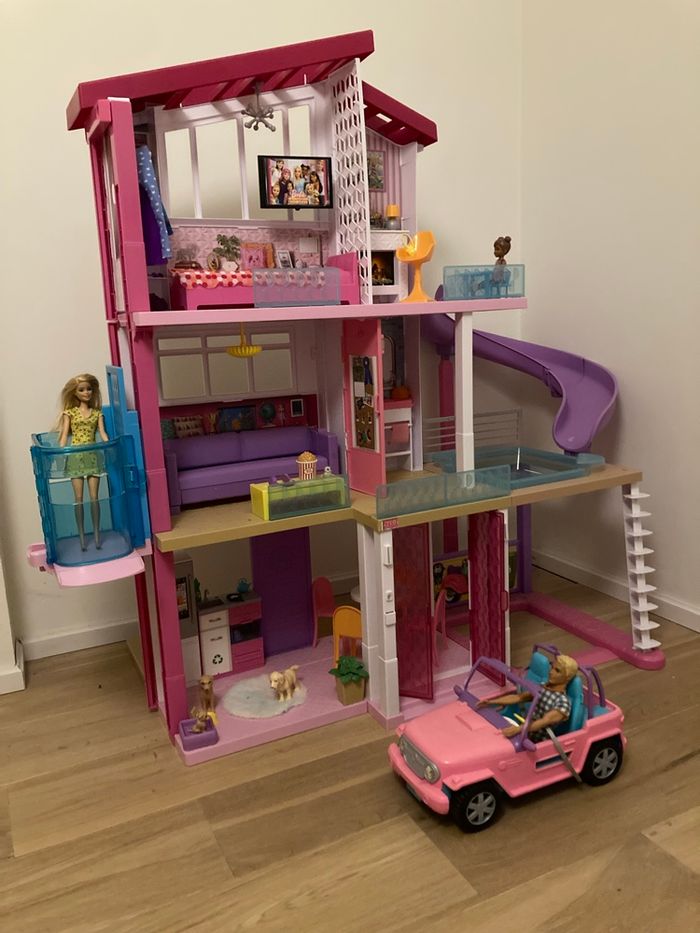 Maison de Rêve de Barbie - 3 étages avec Ascenseur, Piscine, Toboggan et Meubles - 70 Accessoires - 90 x 120 cm Inclus dans le lot: Jeep Barbie et 3 poupées (Barbie, Ken et une ado) En bon état - pas d’envoi