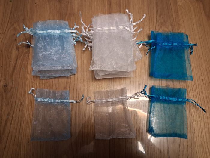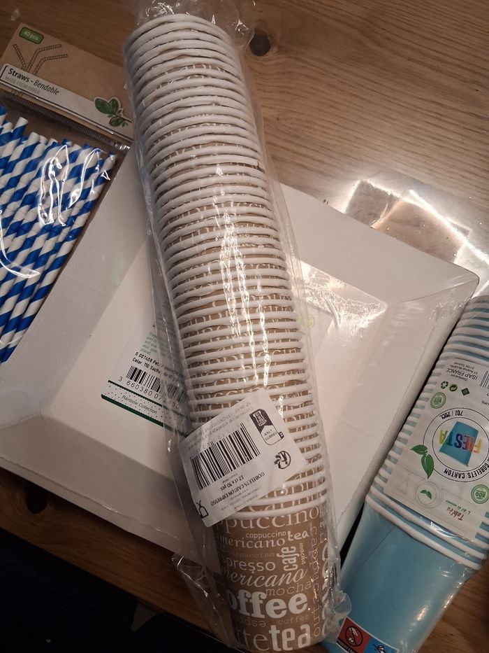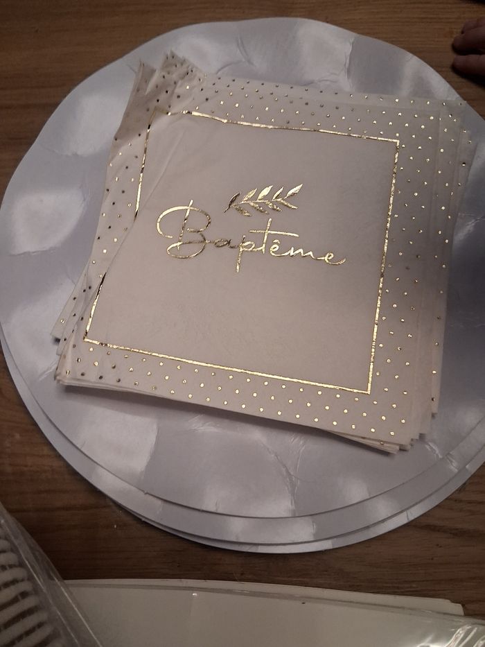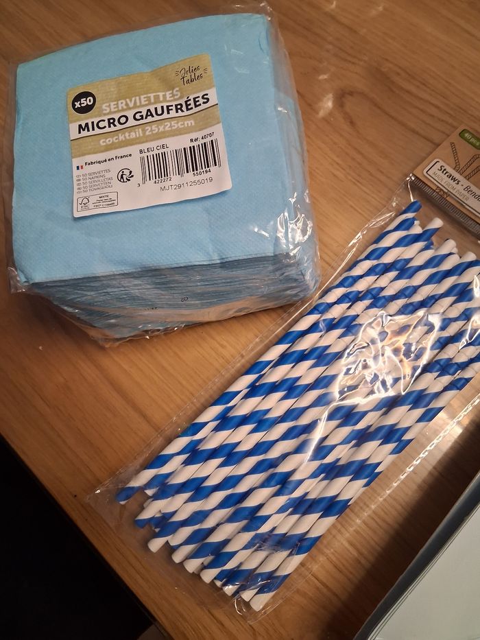Je vends un lot de décoration pour baptême, comprenant des gobelets (2x8 gobelets bleu turquoise, 25 gobelets bleus pâle et 48 petits gobelets expresso) ,25 pailles flexibles en papieret des serviettes en papier de couleur bleue x50 (scellé),9 serviettes imprimé Baptême couleur or et 19 assiettes carrés bleus donc 10 scellé et 7 assiettes blanches en carton. + sachets dragées.
