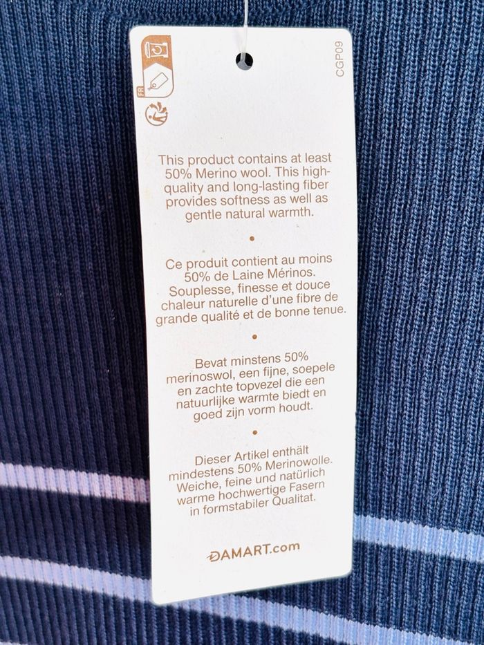 Pull bleu marine, col montant à rayures contrastées Damart T38/40 50% laine mérinos pour la chaleur et la douceur 50% acrylique pour la facilité d'entretien Lavable en machine, cycle laine Longueur à partir du bas du col 64cm Poitrine 72cm Taille 38/40 Neuf, sans utilisation. Avec étiquette ⛔️ Prix FIXES, NON négociables 🚨  👏🏻 Réductions sur les lots 👍🏻 #femme #damart #bleumarine #pull