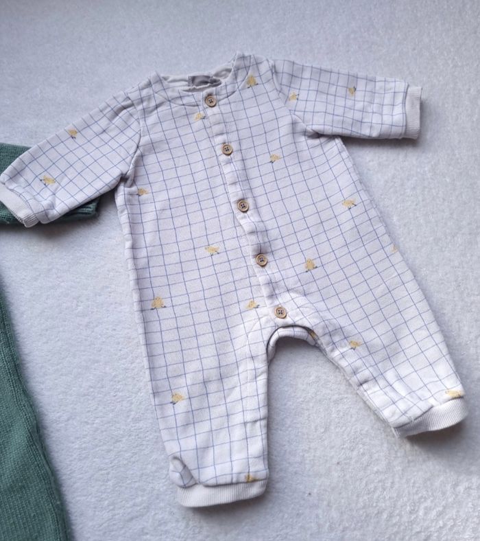 Combinaison en coton imprimée d'un joli motif à carreaux avec des poussins. Très peu portée. Les étiquettes ont été coupées par confort.