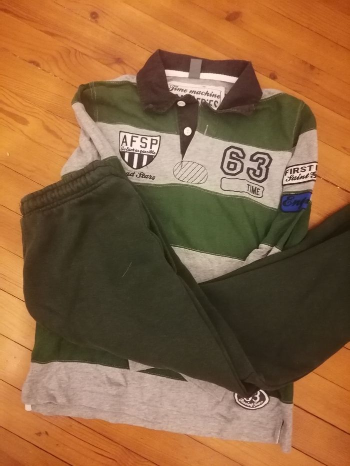 Tenue sport 2 pièces garçon 12 ans 💚Pantalon de jogging Pepperts vert molletonné 12 ans En très bon état, porté 1 ou 2 fois. Coton et polyester. Taille élastique réglable par cordon. 2 poches avant. 🩶Polo manches longues garçon Zara kids 10 ans, taille grand. Très bel article, très bon état général, couleurs sympas, vert foncé, gris et bleu marine. Pas d'étiquette de composition. Boutons encolure nickels. Écussons. Idéal à l'école, pour le sport, pour la maison, pour jouer dehors... Super look sport décontracté. Faites un lot, 10% de remise dès 5 articles achetés !! 🎶