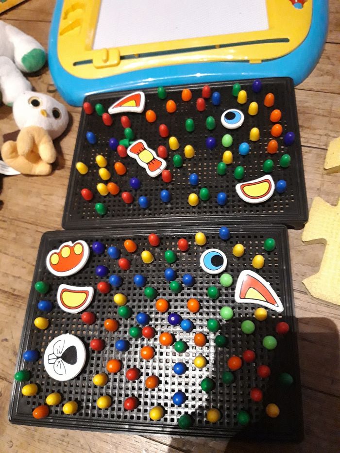 Lot de jeux composé de : - Mosaiques (sans boite) - ardoise magique avec le stylo mais il manque les tampons - 3 peluches - 1 boite vide oui oui Bon etat 1 € le tout (Caisse MARJO)