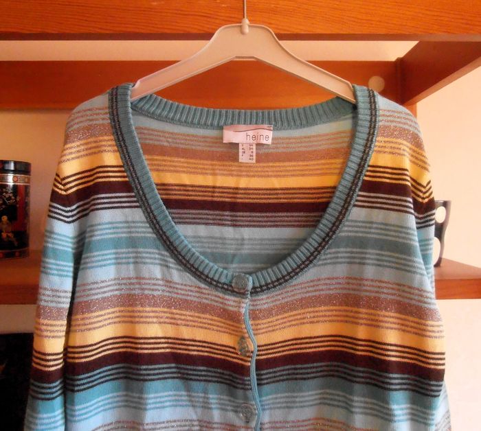 Cardigan, gilet femme, marque Heine , taille S 36, couleurs bleu, marron, jaune, et argenté, motif à bandes horizontales. Mailles fines, Col rond, manches longues, rangé de boutons transparents. En bon état (juste deux petites marques de décoloration : voir photo). Bien pour toutes saisons !