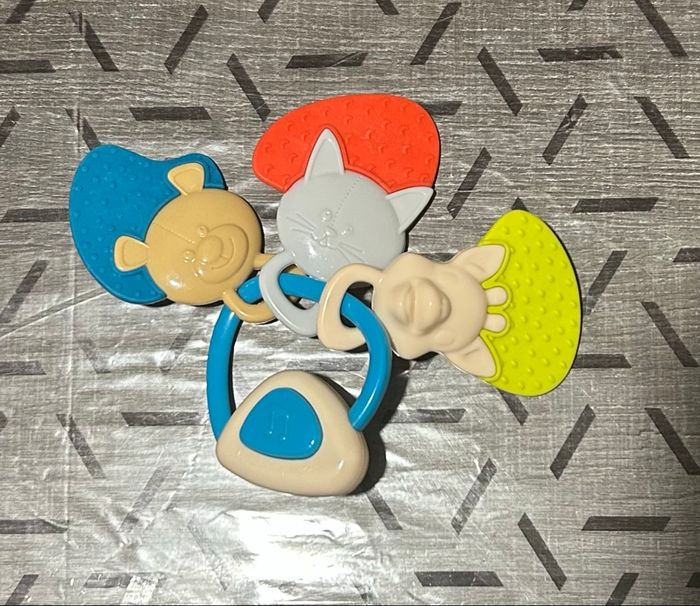Hochet clés Sophie la girafe pour soulager les poussées dentaires de votre bébé. Matières souples et dures avec différents reliefs et facile à prendre en main Le jeu est neuf ma fille en a jamais voulu pour faire des dents. Et le petit bouton qui fait la musique on l’a utilisé très peux de fois et il ne fonctionne plus
