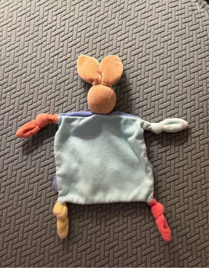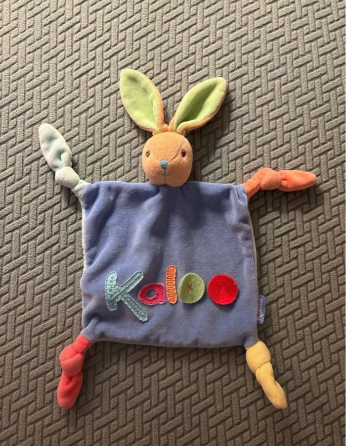 Doudou plat lapin KALOO bleu noeuds Le lapin a un noeud à chaque coins de différentes couleurs Coloris : bleu, orange, vert et rouge Dimension : environ 22 cm Le mot "Kaloo" est cousu sur le corps en différentes matières et couleurs.