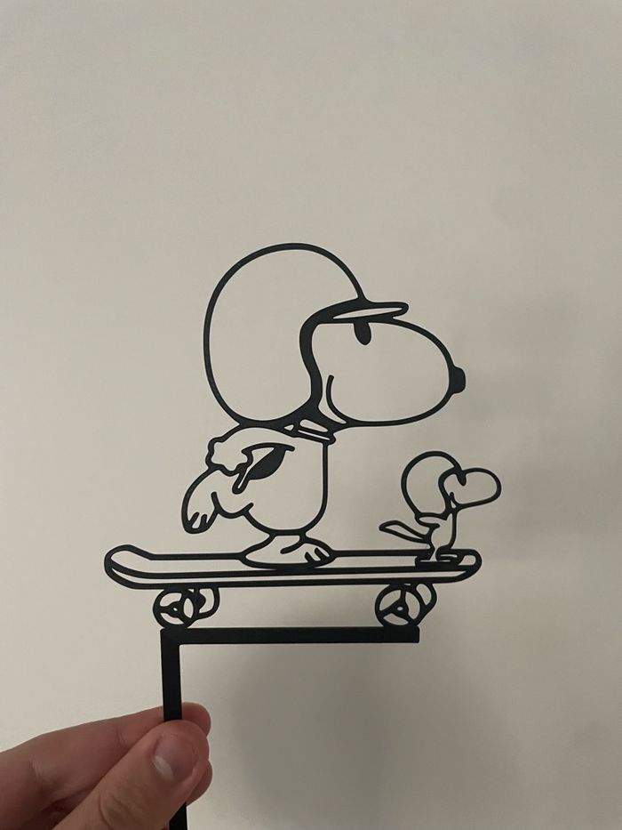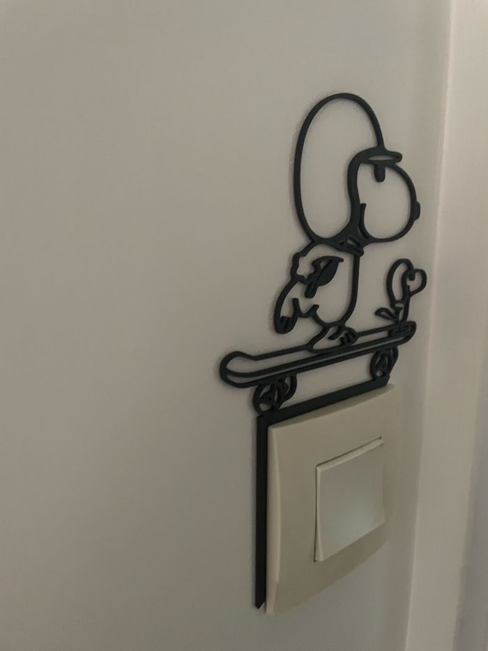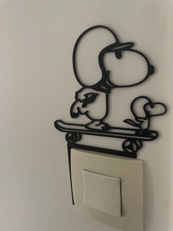 Je vous propose cette décoration d’interrupteur de Snoopy qui fait du skate avec Woodstock fabriqué à partir de plastique bio source
