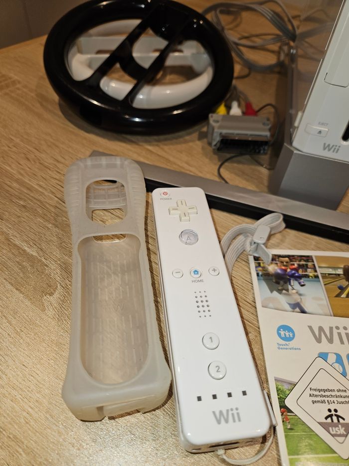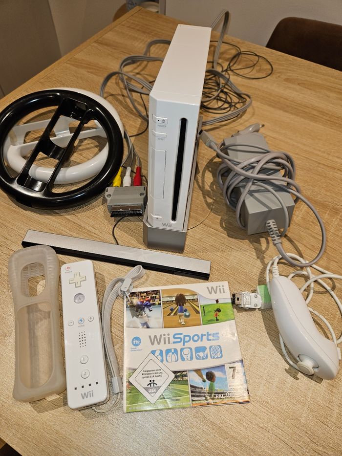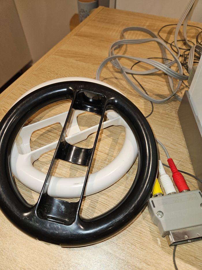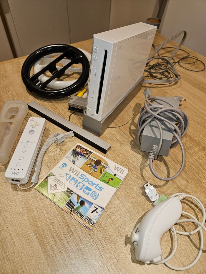 À vendre console Wii très peu servie, comme neuve, mérite d'être utilisée régulièrement et de s'amuser Le lot comprend : - Le jeu Wii Sports - Le support de maintien de la console - Tous les branchements nécessaires - 1 télécommande blanche - Protection silicone de la manette - 1 joystick blanc - 2 volants noir et blanc Tout en très bon état 60€ le lot complet