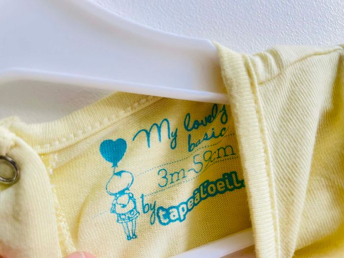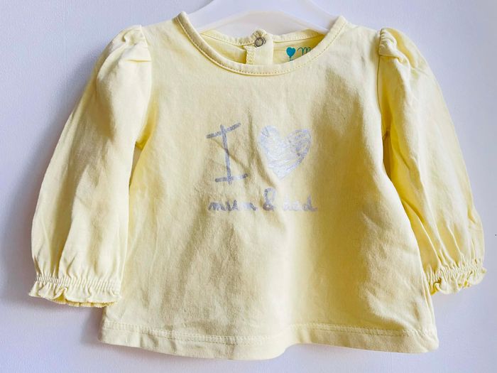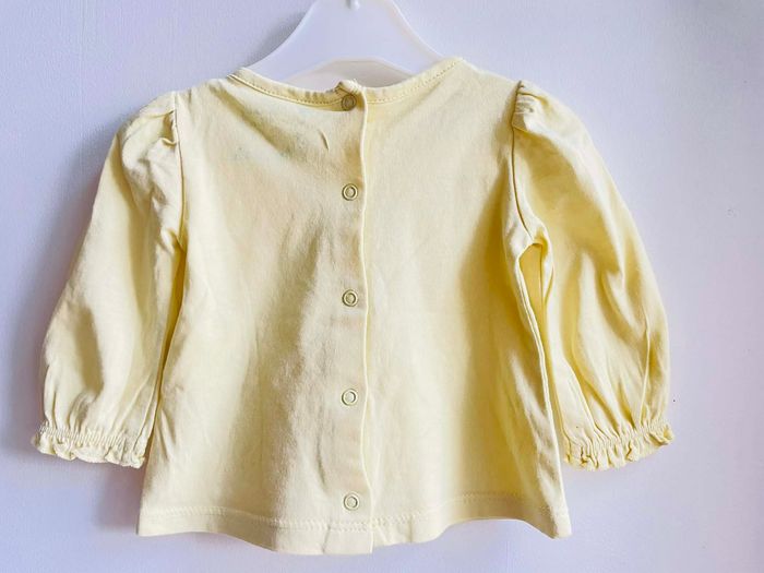 T shirt T 3 mois Marque "Tape à l'œil" En coton Boutons pressions dans le dos Jaune clair avec motifs devant argenté Très bon état Envoie sous 48 h