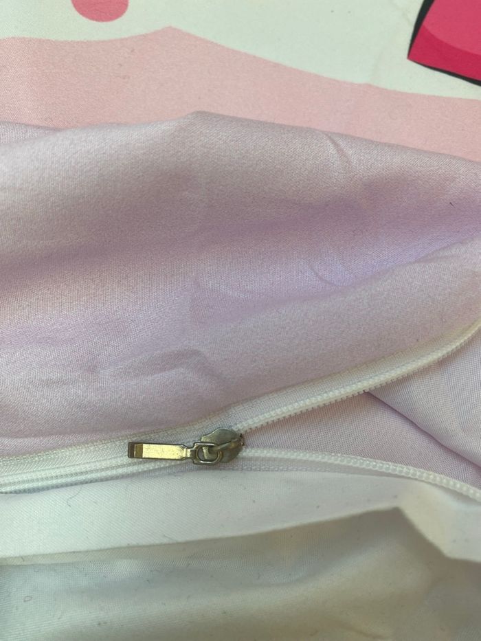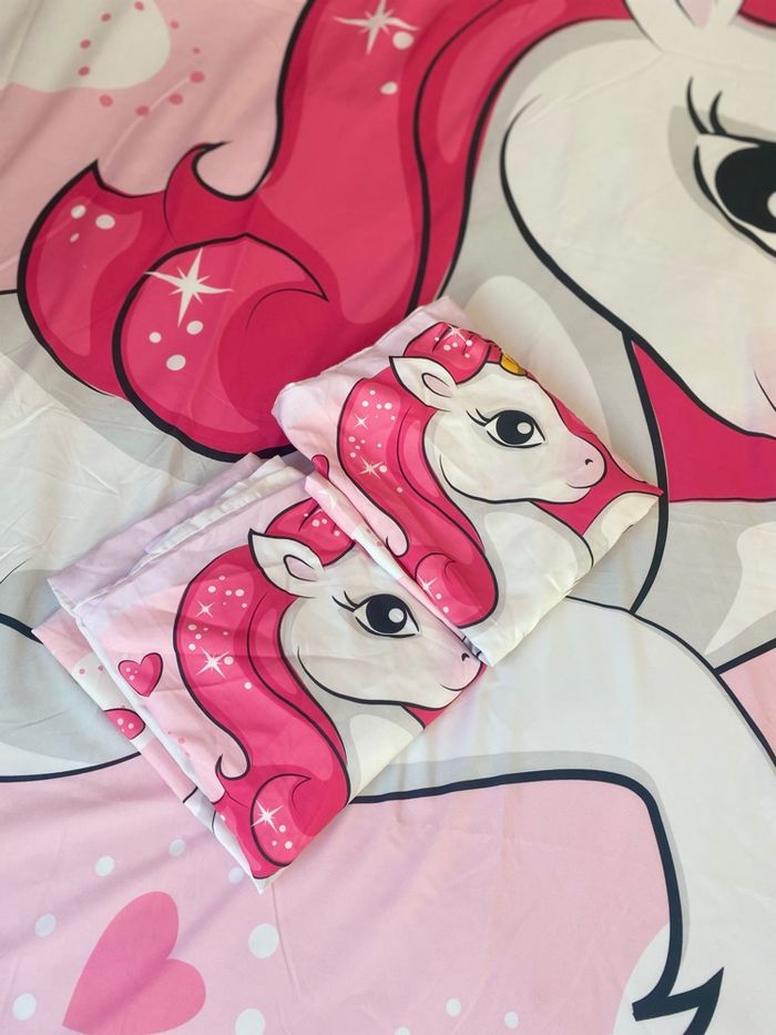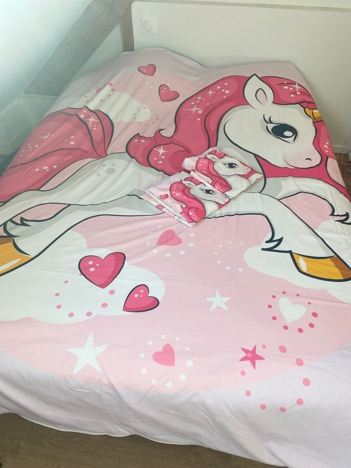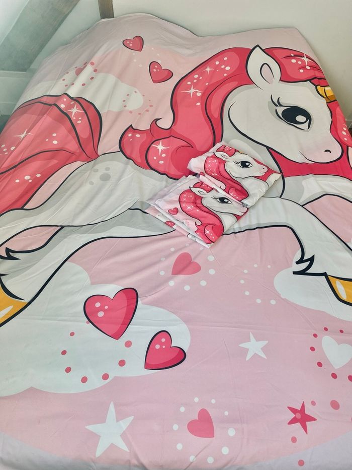 Housse couette 2 places avec 2 taies licorne . Avec fermeture sur le bas de la housse pour refermer la couette . Petites taches à certains endroits mais la couette en elle même est en très bon état