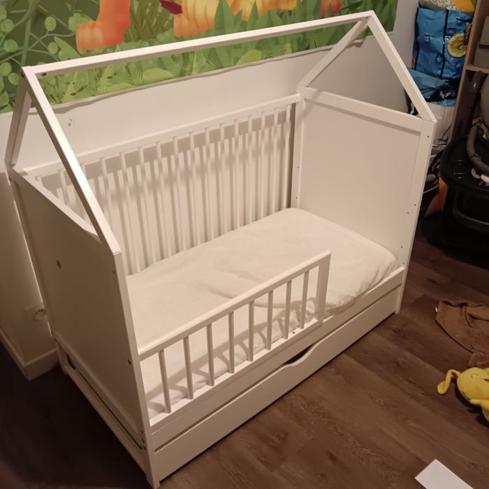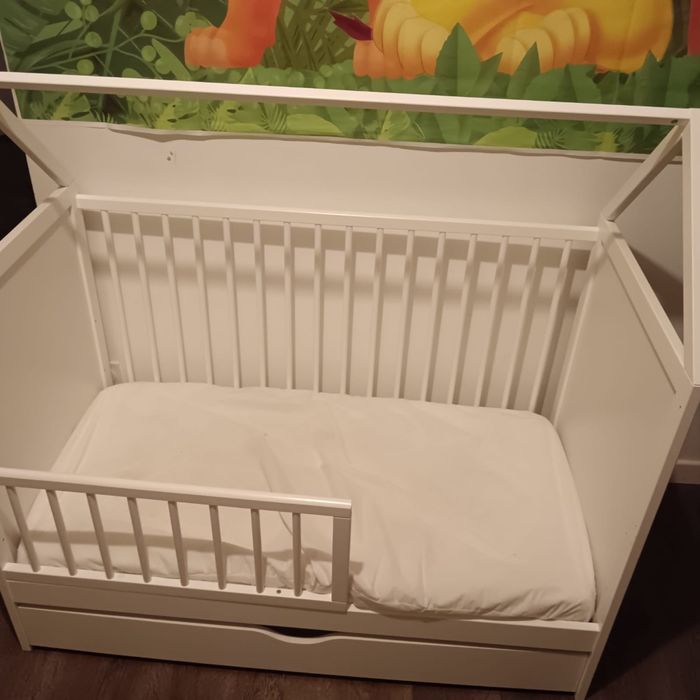 (Sur la photo le lit est en mode évolutif pour un enfant de 1/2ans.) Lit quasi neuf, très peu utilisés. Jusqu’à 2 ans. Vendu avec matelas + alaise + drap housse couleur vert et un couleur blanc.
