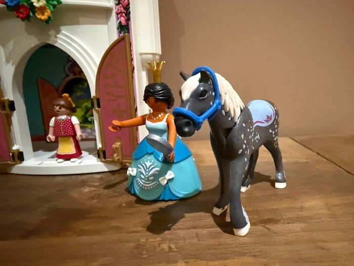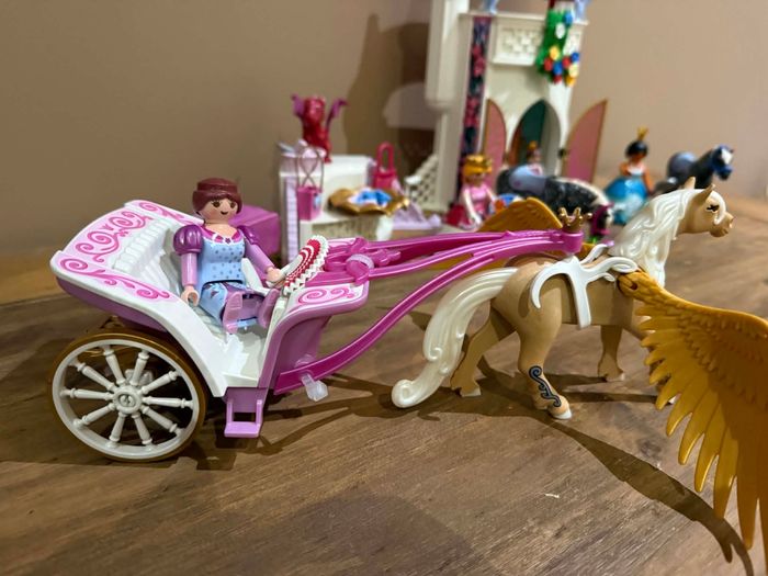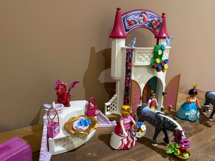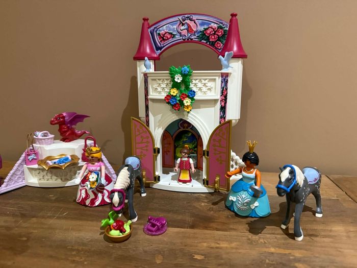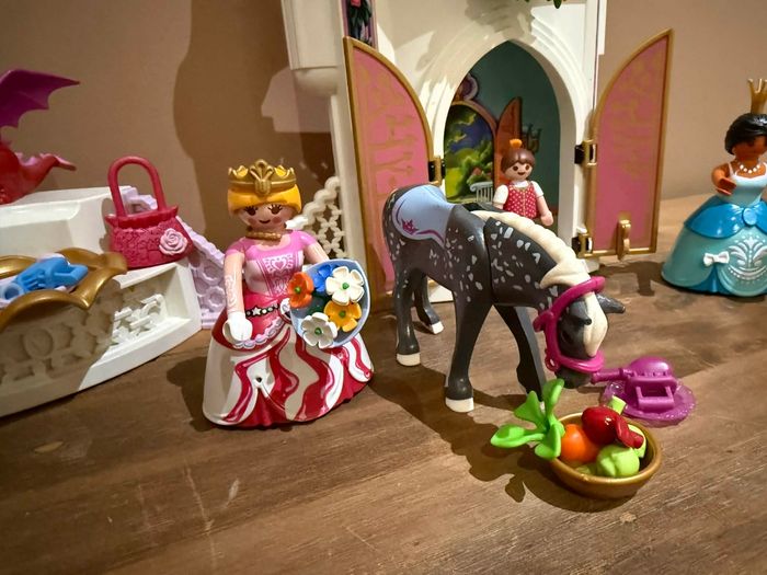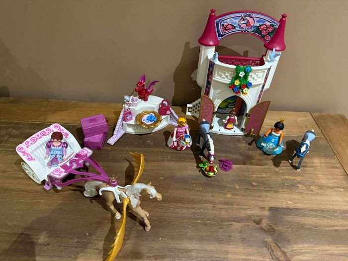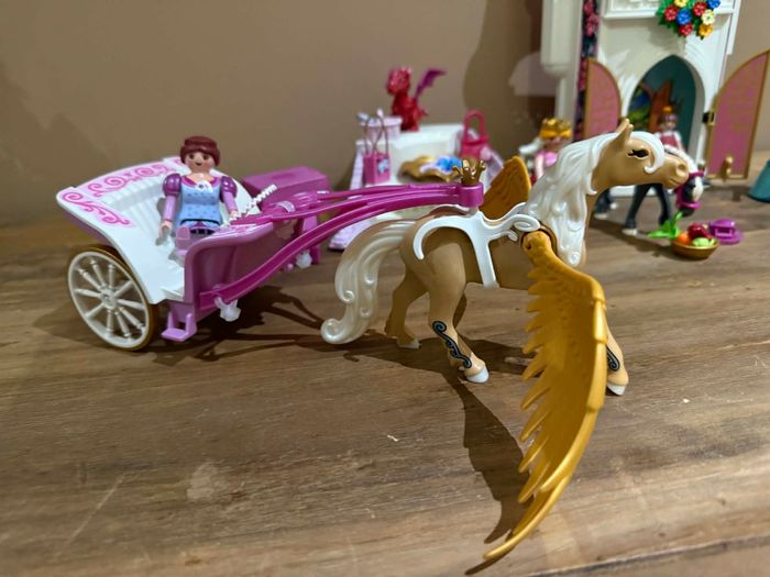 Playmobil Donjon de la licorne transportable 4777 et Playmobil Pricess 5143 Fairy tales Carosse avec cheval ailé Très bon état Set modifié, rajout de beaucoup d'accessoires, chevaux, princesses, dragon Playmobil Donjon de la licorne transportable 4777 Et le set Playmobil Pricess 5143 Fairy tales Carosse avec cheval ailé en Très bon état J'ai mis un bout de plastique car cela tiens mieux Manque juste le coffre rose et la couronne de fleurs