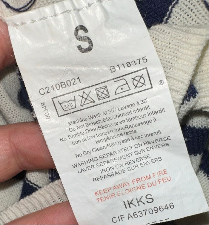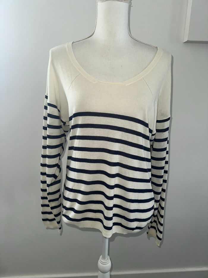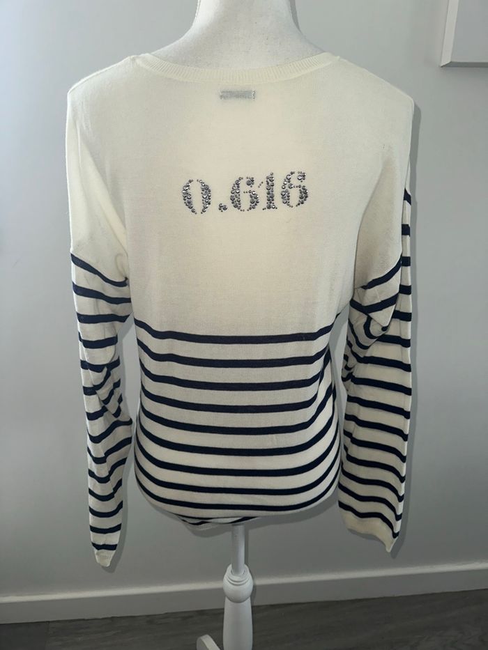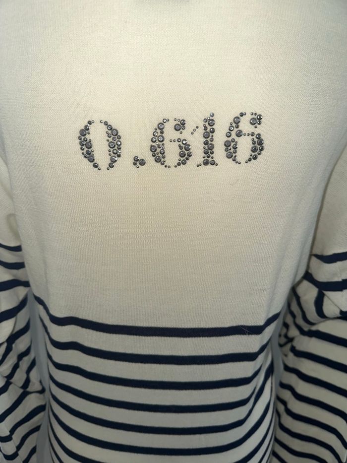 Marinière - Pull fin ou blouse à manches longues - Excellent état - Taille 36 équivalent S Dimensions en bas de l’annonce - Marque IKKS - Blanc crème et bleu marine - Strass argentés dans le dos - Tissus fin - 100% coton Dimensions: - 54 à 60cm niveau aisselles - 70cm de long