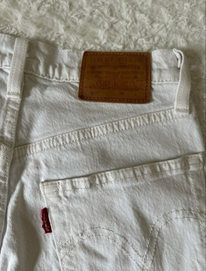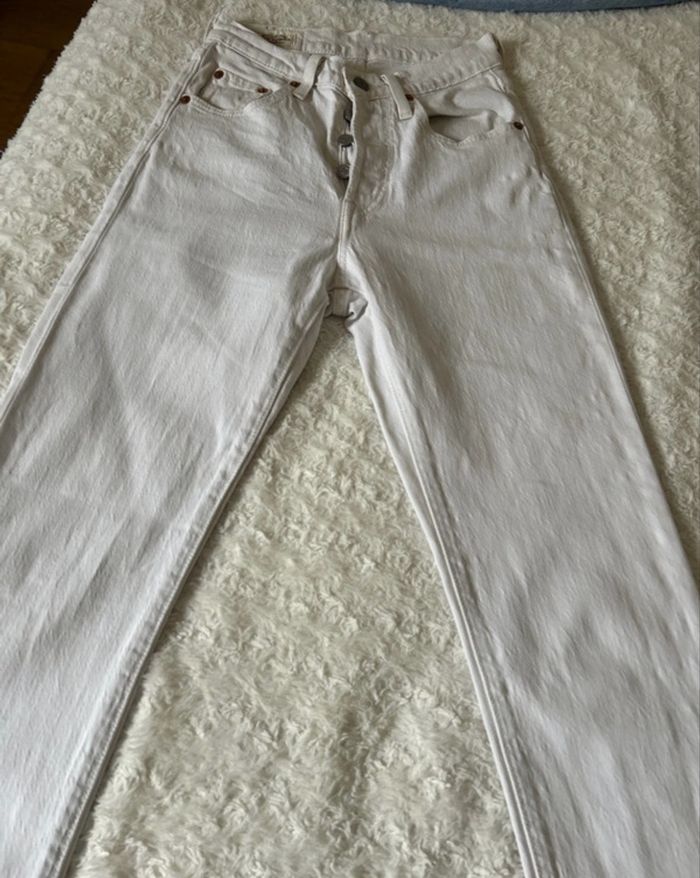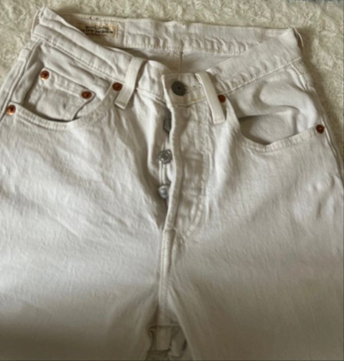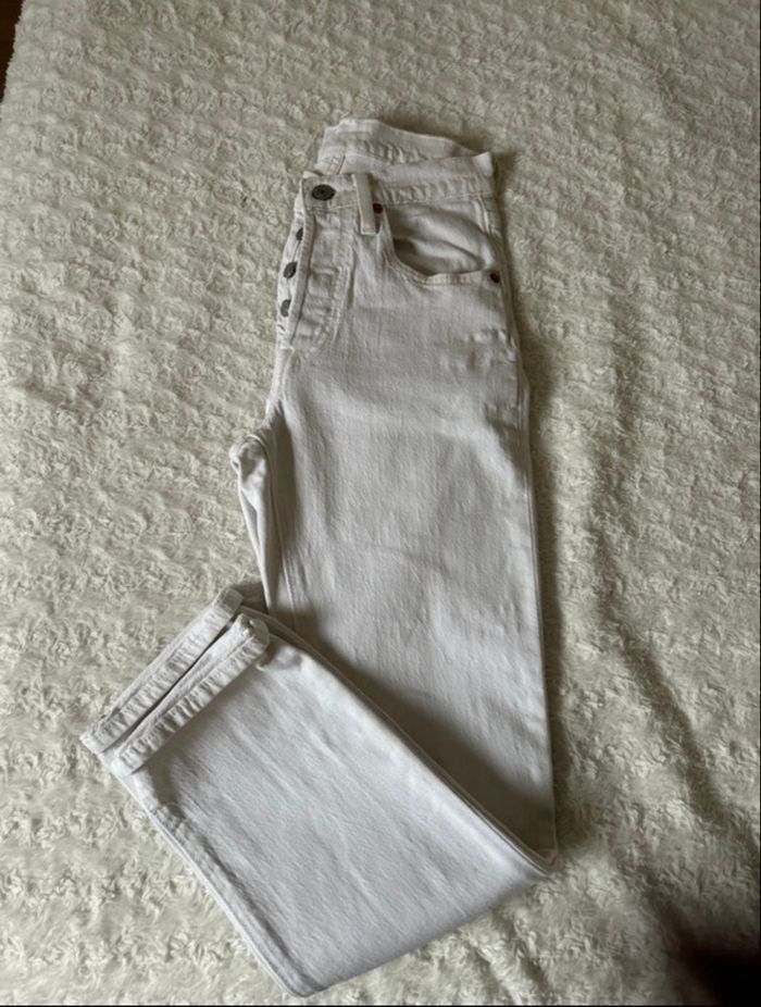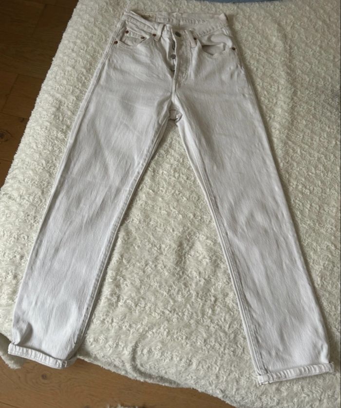 Jean Levi’s 501 blanc Coupe droite Taille haute fermeture boutons Taille 23 longueur 28 Je fais 1m56 Il m’arrive à la cheville Photo porté sur demande