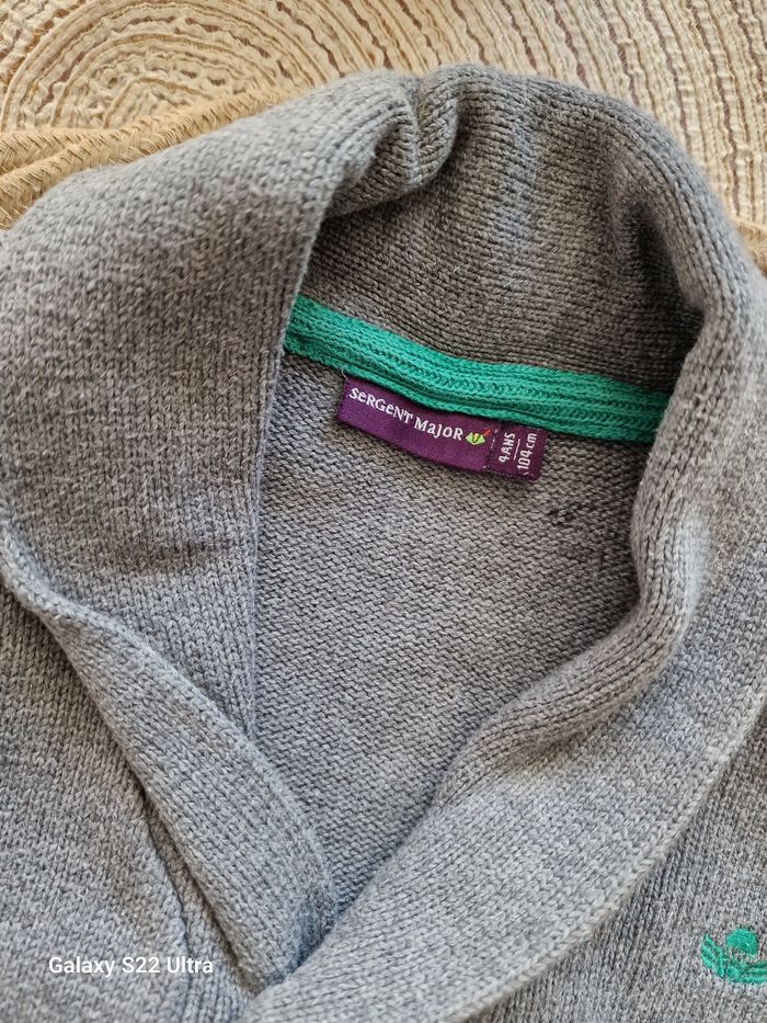 Joli cardigan à col de la marque Sergent Major, taille 4 ans. En excellent état, doux et élégant, parfait pour la mi-saison ou les looks habillés. ✔️ Ouverture par boutons ✔️ Un petit tampon prénom à l’intérieur (quasiment invisible, ne se voit pas porté) Très belle qualité, typique de la marque Sergent Major ✨
