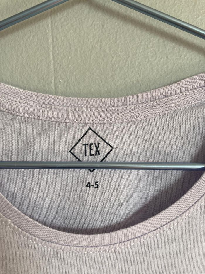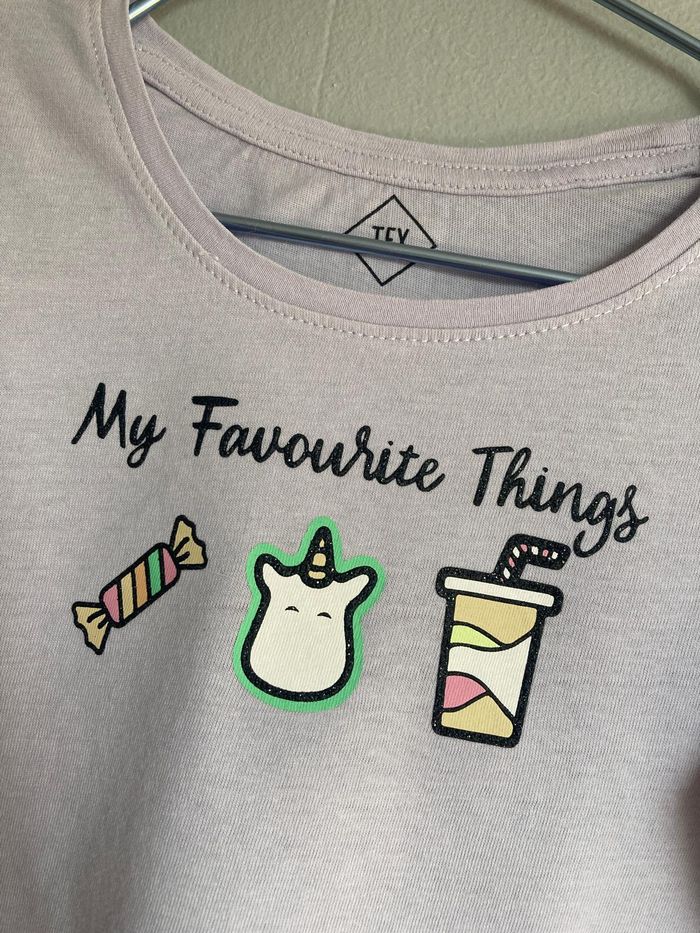 T-shirt à manches longues pour fille de la marque TEX, en taille 4-5 ans. Couleur lilas/mauve clair avec une illustration sur le devant représentant une licorne, un bonbon et une boisson. Le t-shirt est en très bon état. #Worryfree_4ans #TEX #TshirtFille #4ans #5ans #Licorne #Lilas #VetementEnfant #TresBonEtat