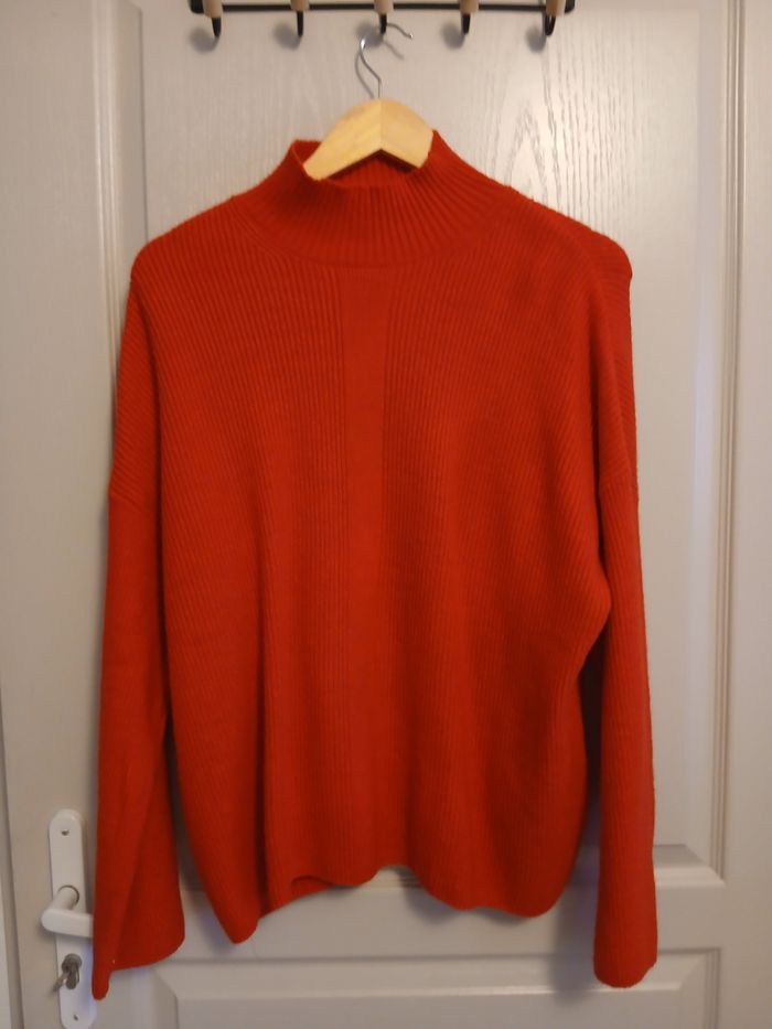 Pull rouge en polyester et viscose. 44 cm de largeur des épaules 58 cm de largeur des aisselles 63 cm de longueur