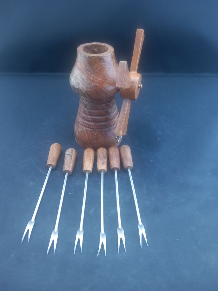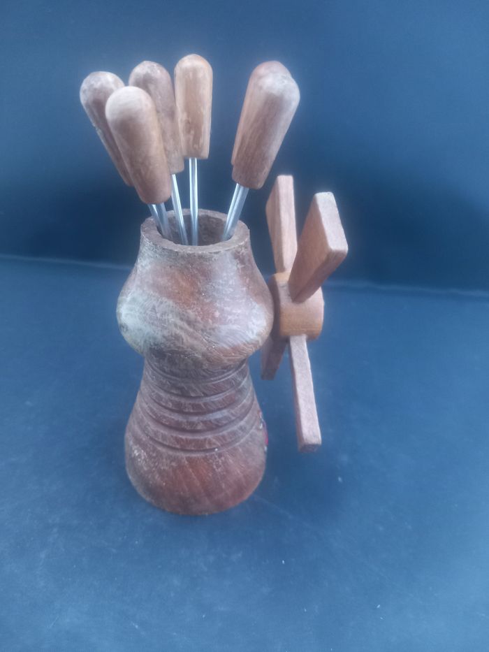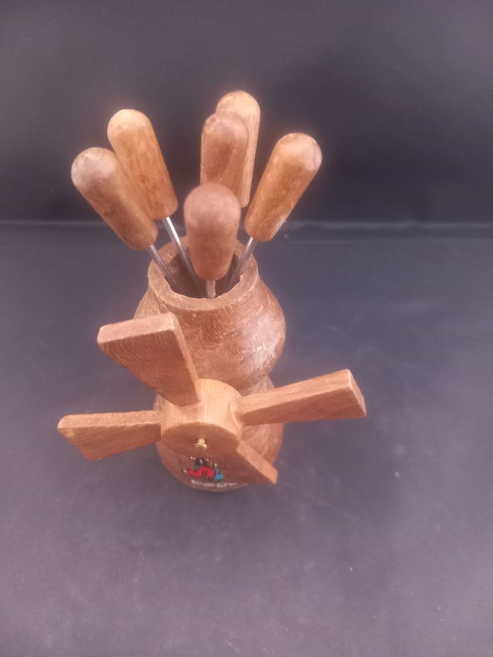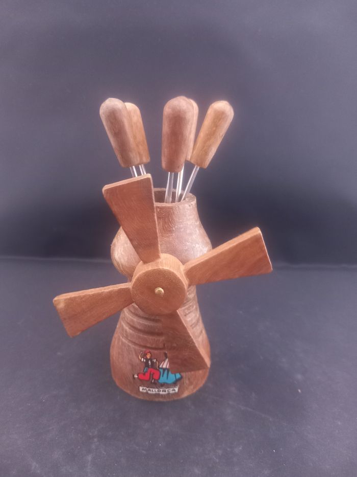 6 fourchettes a escargots Se range dans leur petit moulin Couleurs marron, argenté et multicolore Matière bois et métal Motifs couple de Mallorca Dimensions approximative moulin : Hauteur 9cm : 5cm de diamètre : fourchettes 9,5cm de long : 1cm au plus large En bon état