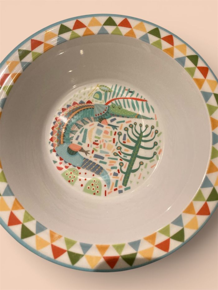 Bel ensemble comprenant une assiette plate et un bol coordonnés de la marque Zara Home Kids, en mélamine. La vaisselle présente des illustrations graphiques et colorées : un renard stylisé sur l'assiette et un crocodile dans le bol, avec des bordures géométriques assorties. Cet ensemble a été utilisé, mais il reste en très bon état général. #zarahome #zarahomekids #vaisselleenfant #repasenfant #melamine #assietteenfant #bolenfant #artdelatable