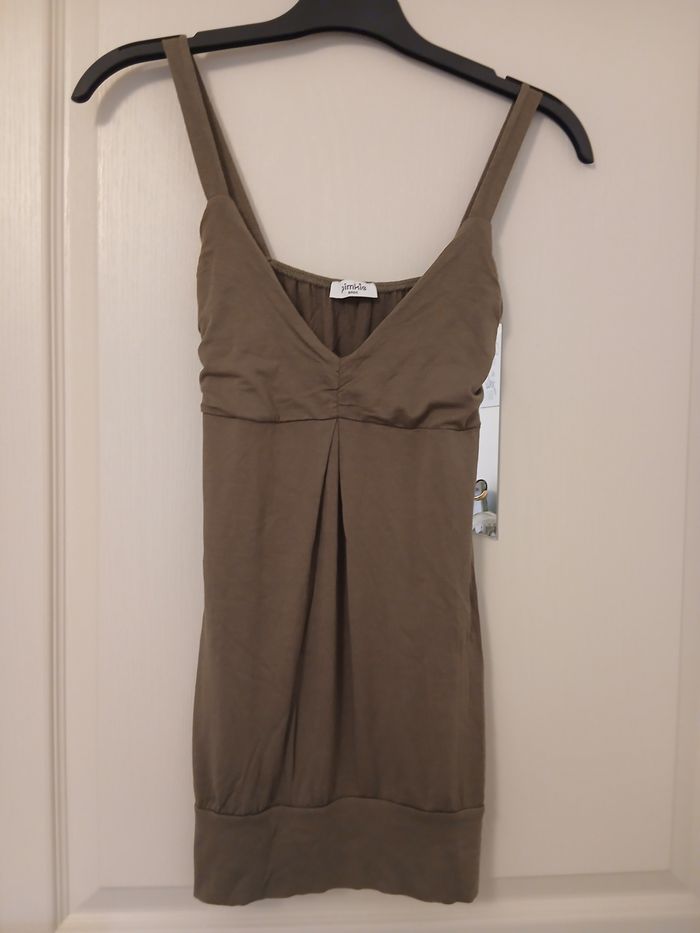 Top kaki en viscose et élasthane. 34 cm de largeur des aisselles 69 cm de longueur