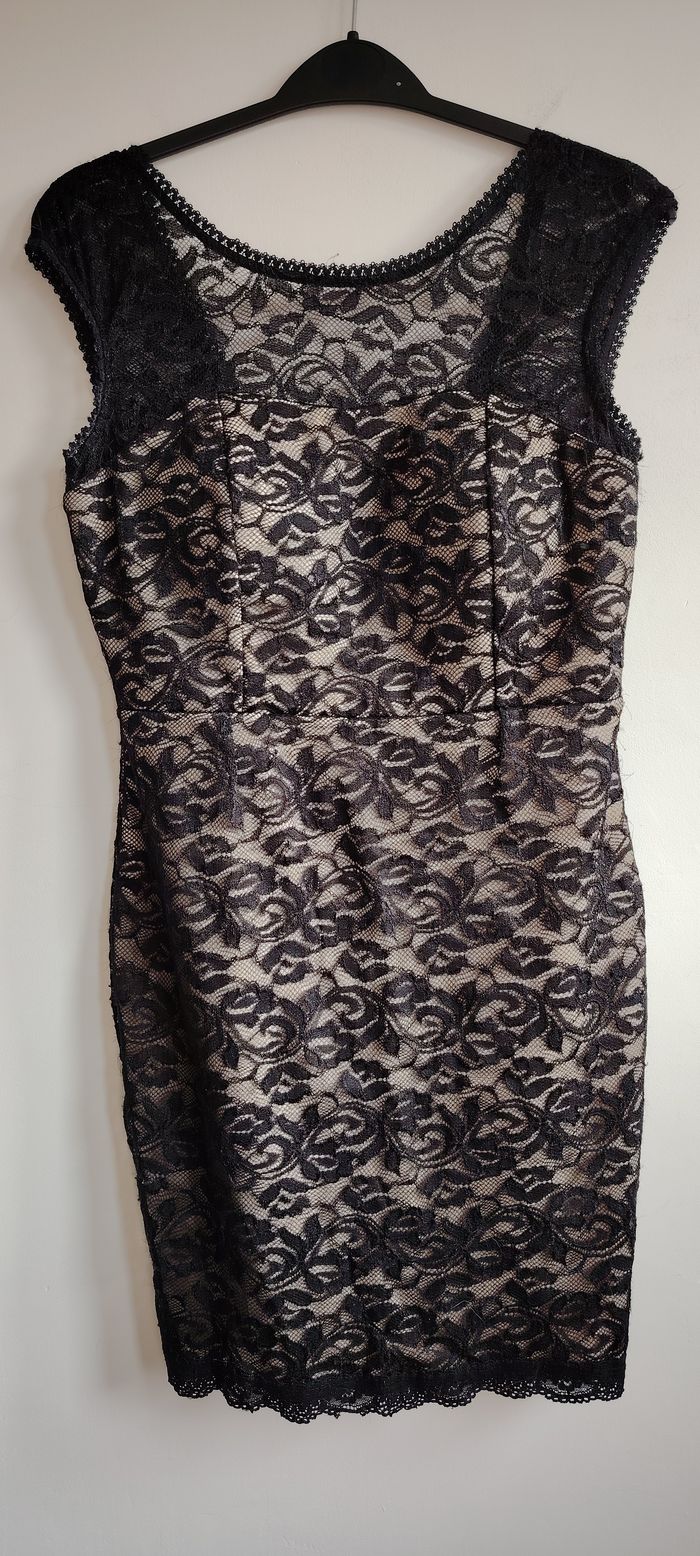 Robe femme noire élégante, entièrement recouverte de dentelle florale avec doublure claire contrastante. Coupe ajustée et féminine, longueur au-dessus du genou. Encolure arrondie avec fin liseré en dentelle, emmanchures larges pour un maintien confortable. Fermeture zippée apparente au dos, apportant une touche chic et moderne. Matière souple et agréable à porter, idéale pour une soirée, un événement ou une tenue habillée. Style intemporel, facile à accessoiriser avec talons ou bottines. #femmevale62100 #robevale62100 #tailleMvale62100 #robe #robedentelle #tailleM #robeM