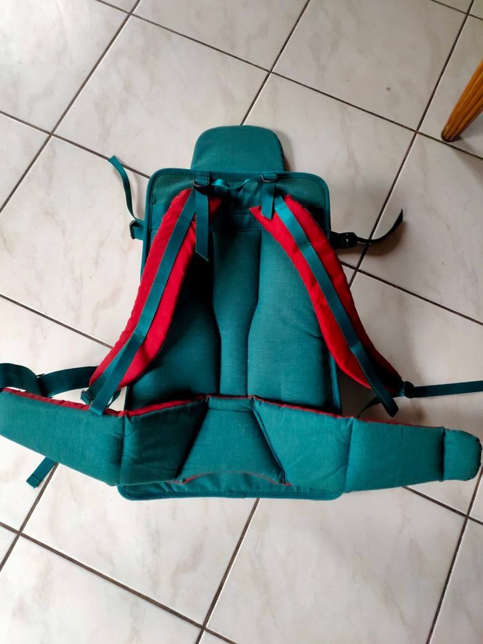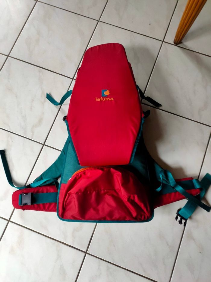 Porte bébé de randonnée coloris bordeaux et vert foncé, modèle Vintage,système de portage ergonomique avec bretelles et ceinture rembourrées ce qui le rend très confortable. Marque Lafuma, il a été utilisé occasionnellement pour 1 enfants, il est en très bon état. Pour enfants qui tient assis seul..