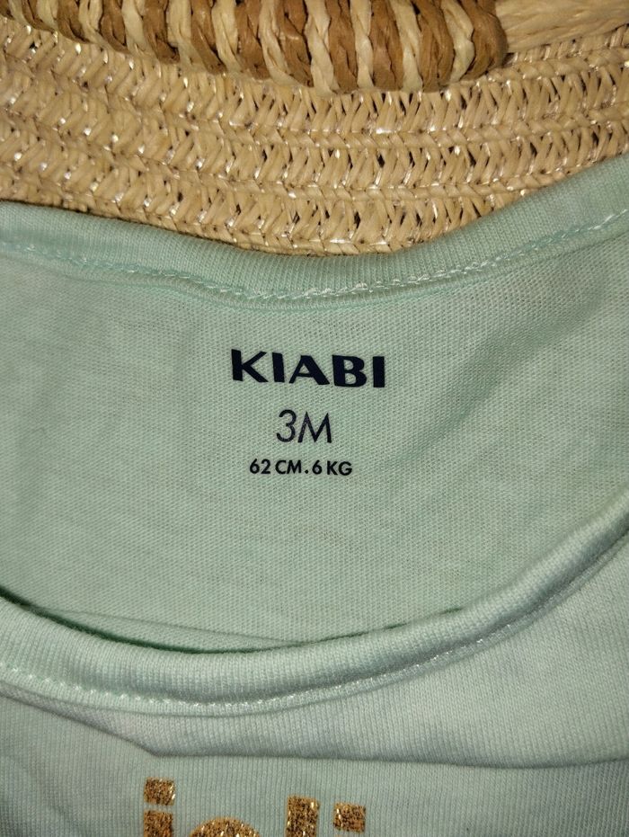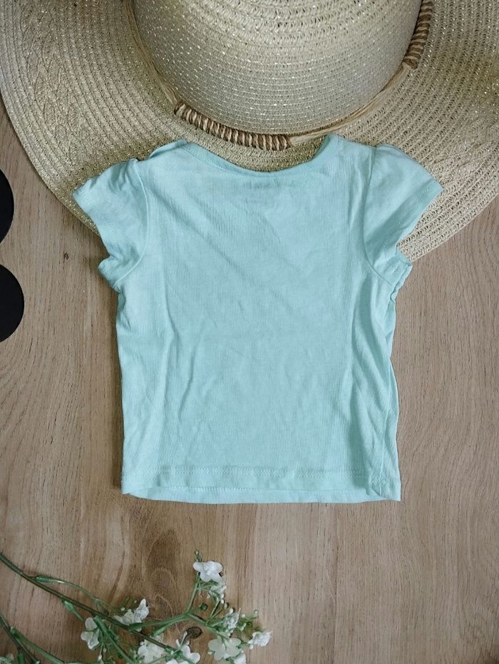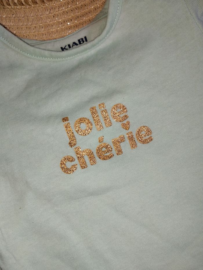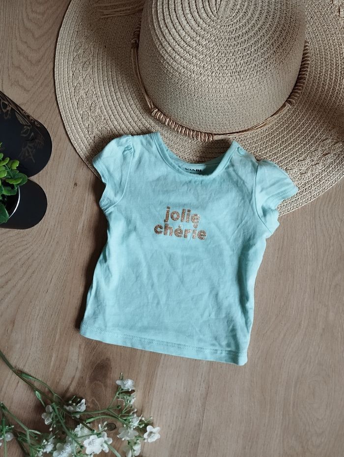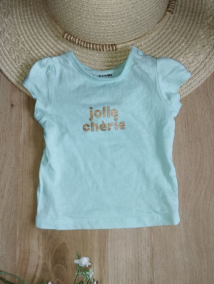 T-shirt léger, couleur vert d'eau. Imprimé doré " jolie chérie" Taille 3 mois