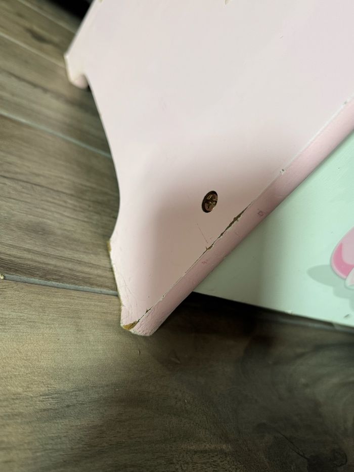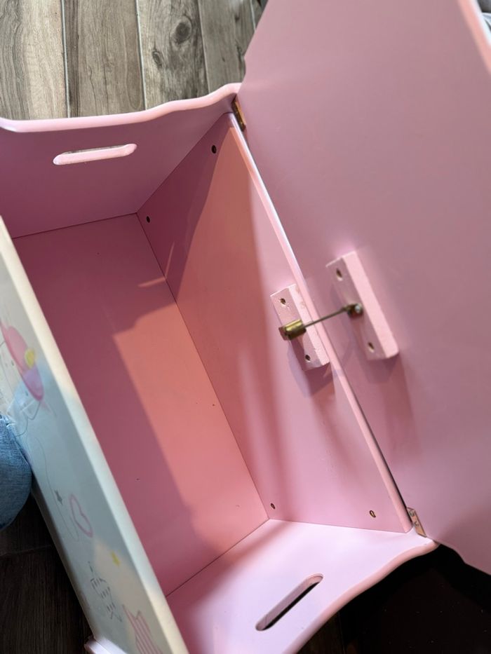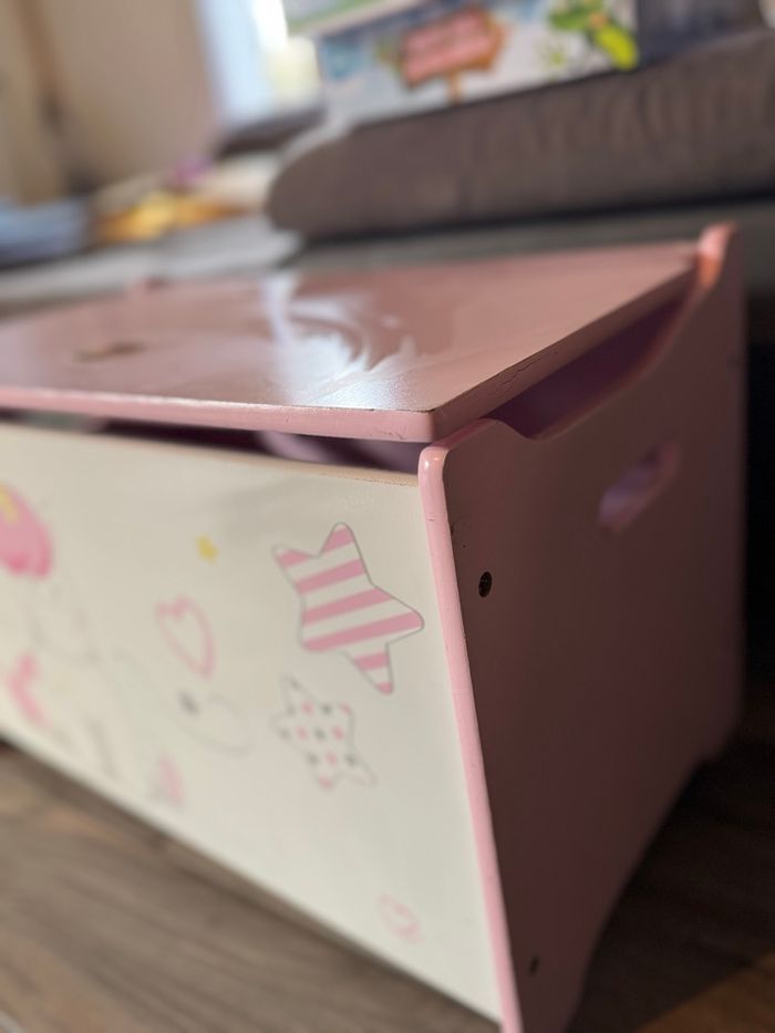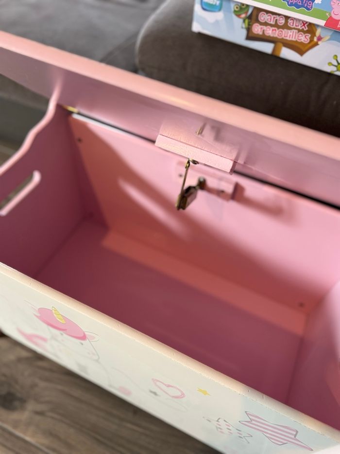 Coffre à jouet / rangement licorne pour petite fille 🦄 En bon état , présente quelques endroit craquelé ou abimé photo (usé) , mais reste en bon état , l’intérieur est en bon état il y à pas mal de place 🌸 Dimension : 60x38 Il est assez léger à porter. Autocollant de petit chat dessus que je ne peut pas enlever. Envoi rapide et soigné 🌷