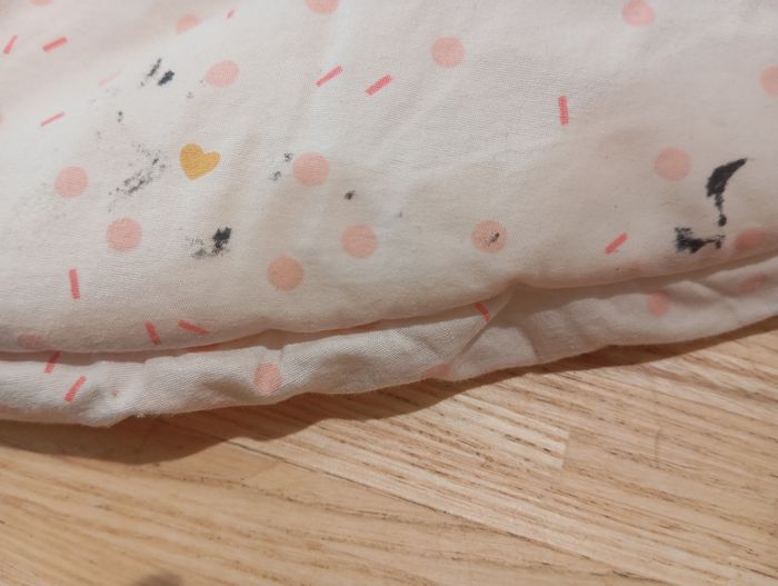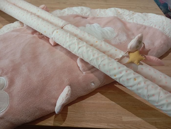 Tapis éveil avec arche rose pâle maison du monde acheté en 2021 Quelques tâches de peinture noire derriere qui donne par terre comme montrées en photos autrement très bon etat. Valeur neuf 50€ Je donne avec une spirale jeux suspendus complets et comme neufs, peu servi. Acheter neuve 20€ chez sergent major, rose pâle également.