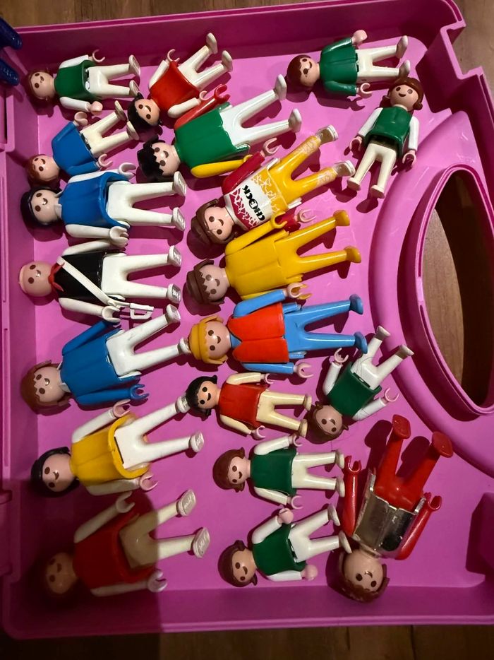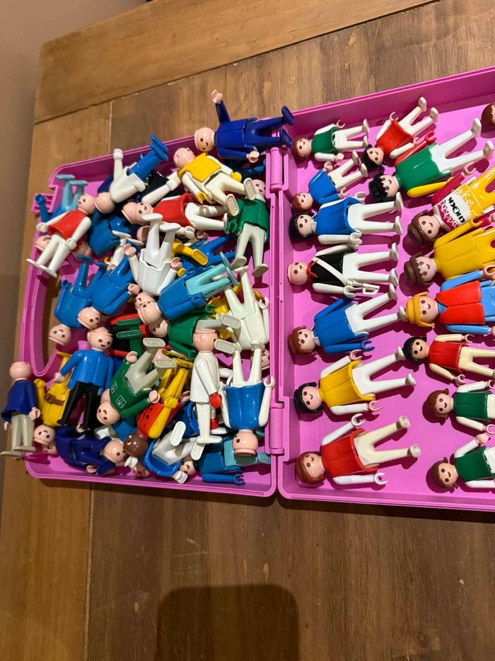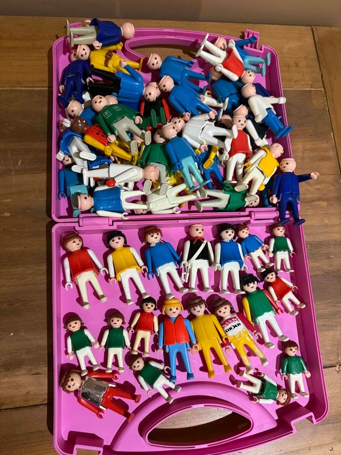 Lot personnages vintage/anciens Playmobil Bon état 40 personnages sans cheveux 9 personnages avec cheveux 8 personnages enfants Lot personnages vintage/anciens Playmobil Valisette comprise avec le lot