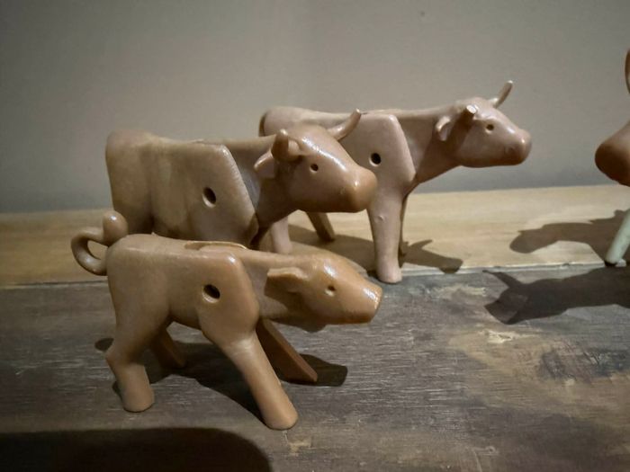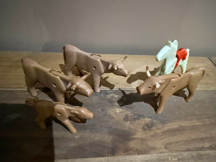 Lot playmobil animaux vintages vaches et cheval Bon état 2 vaches ont 1 corne cassée Le cheval a la queue cassée et jaunis Le veau et une vache sont en très bon état Lot playmobil animaux vintages vaches et cheval