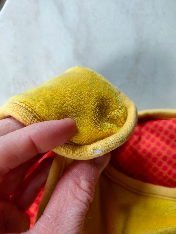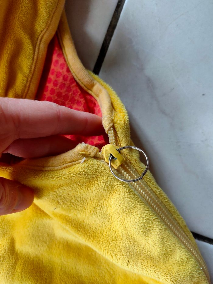 Grande gigoteuse hiver en velours, chaude. Taille 3 soit 18/36 mois .Grande fermeture éclair sur le côté, il manque la tirette, mais elle fonctionne très bien, elle a également un petit trou sur un biais de finition (voir photo), les velcro sont encore bon. Elle a été utilisé, elle est en bon état.