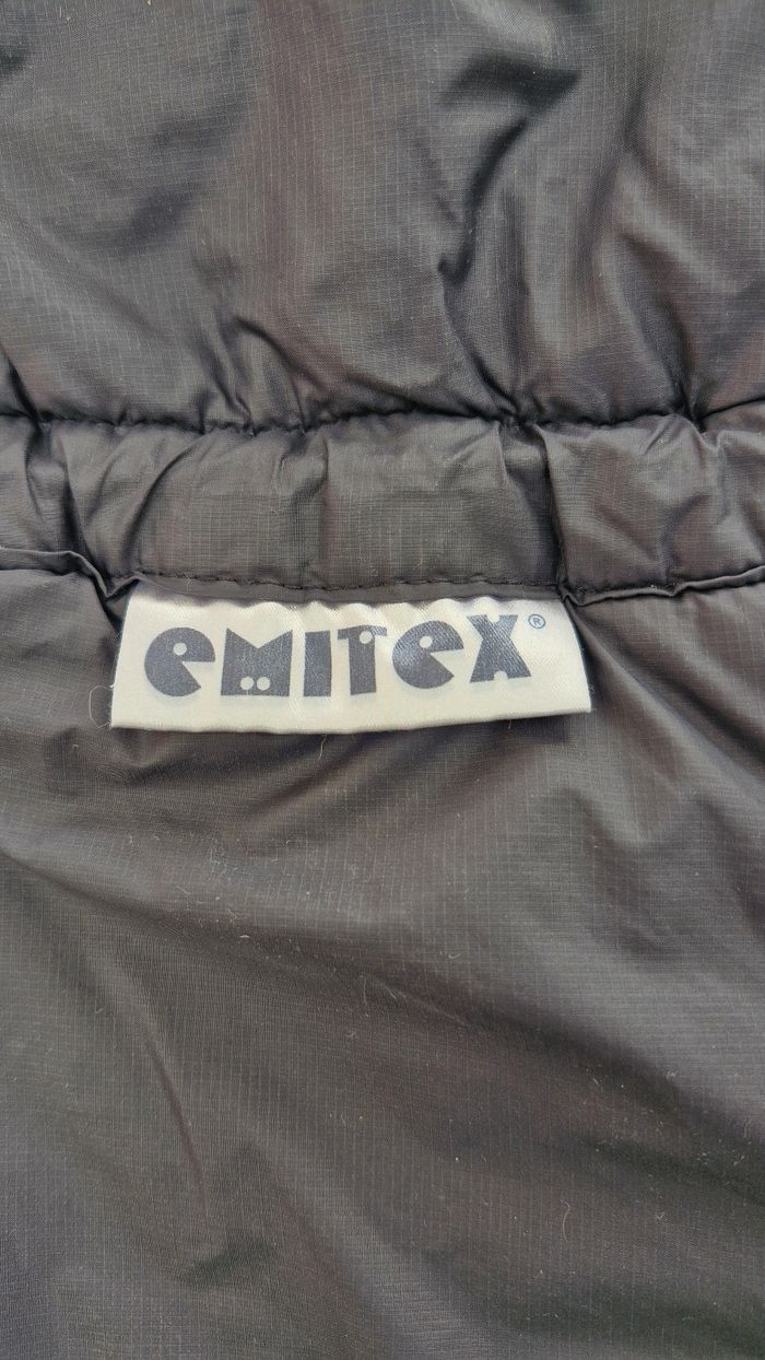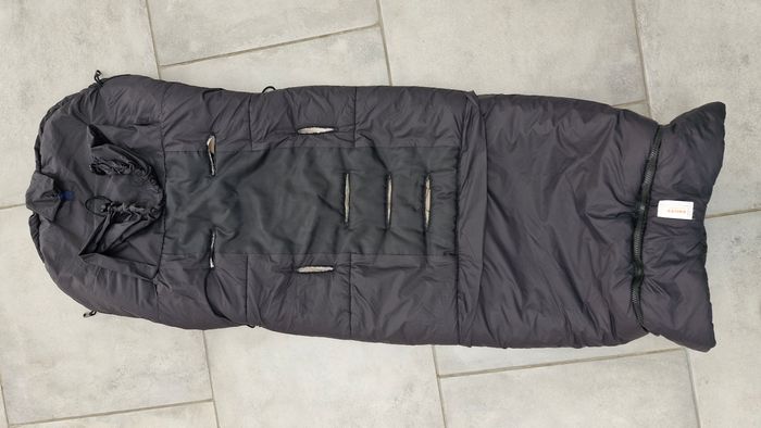 Chaude et moelleuse. Fermeture par zip et boutons pression. Liens pour resserrer au.niveau de la tête et du cou. Extérieur noir et intérieur polaire crème. Utilisable jusqu'à 36 mois selon la taille de bébé. Passe en machine. Très bon état. Juste un petit accroc visible sur la droite de la photo 6.