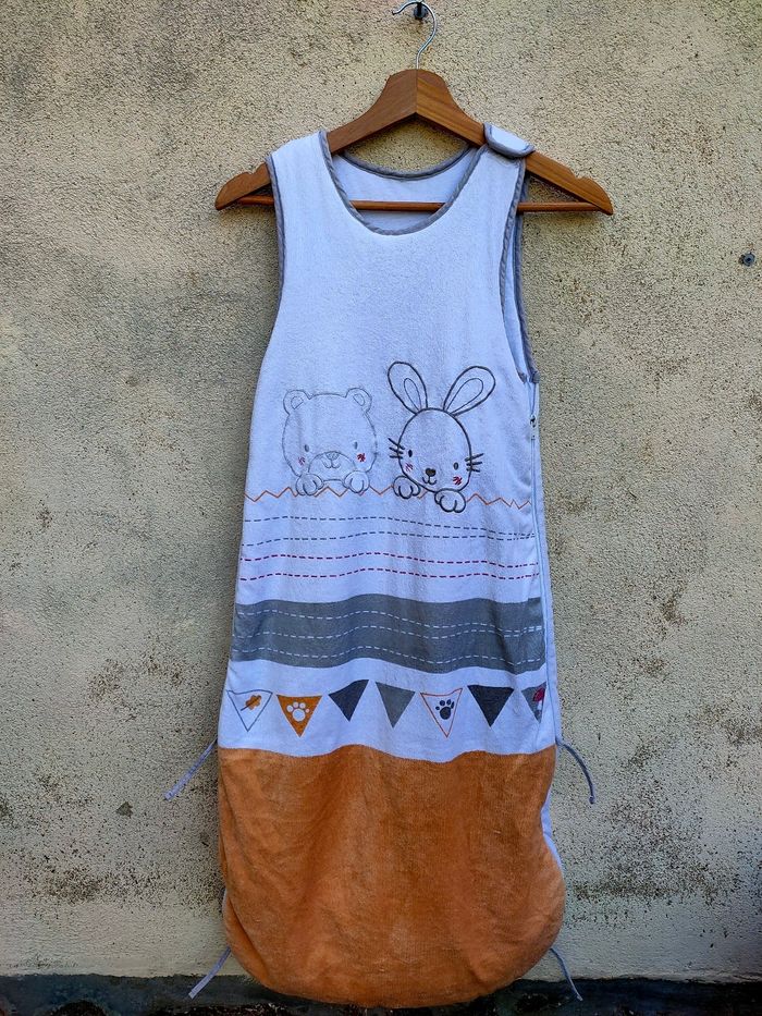 Grande gigoteuse hiver en velours, a motif lapins. Taille 3 soit 18/36 mois .Grande fermeture éclair sur le côté, une bretelle avec velcro. Le velcro a été changé et il y a un petit trou en dessous du velcro a l'intérieur (voir photo). Elle reste en bon état.