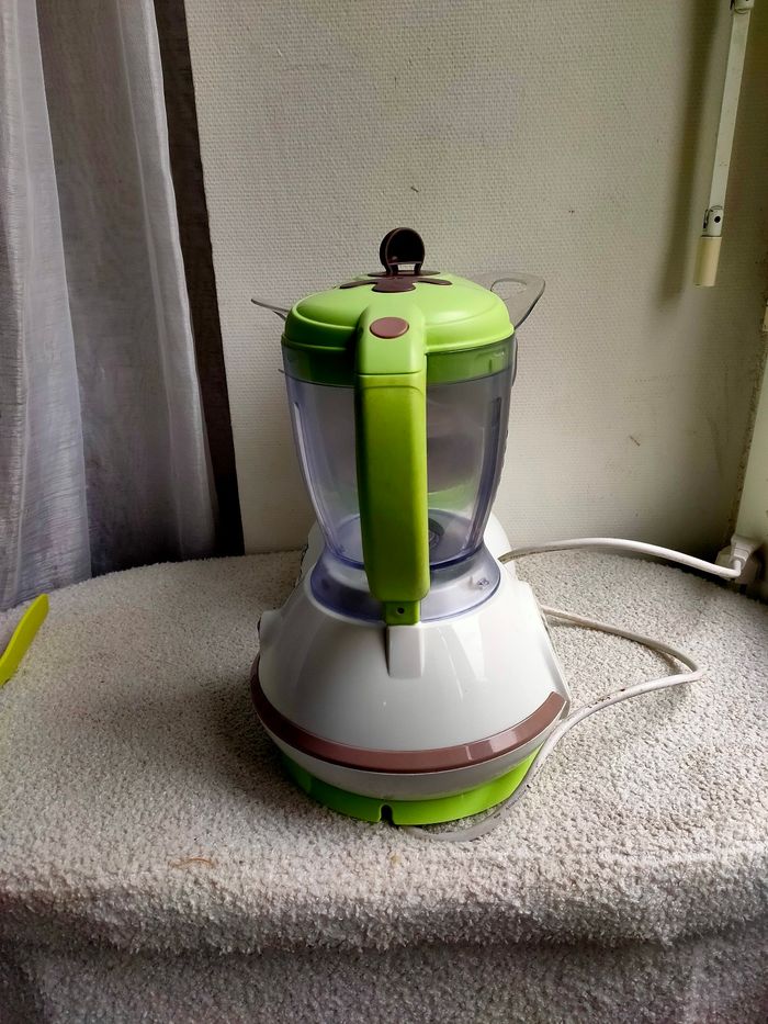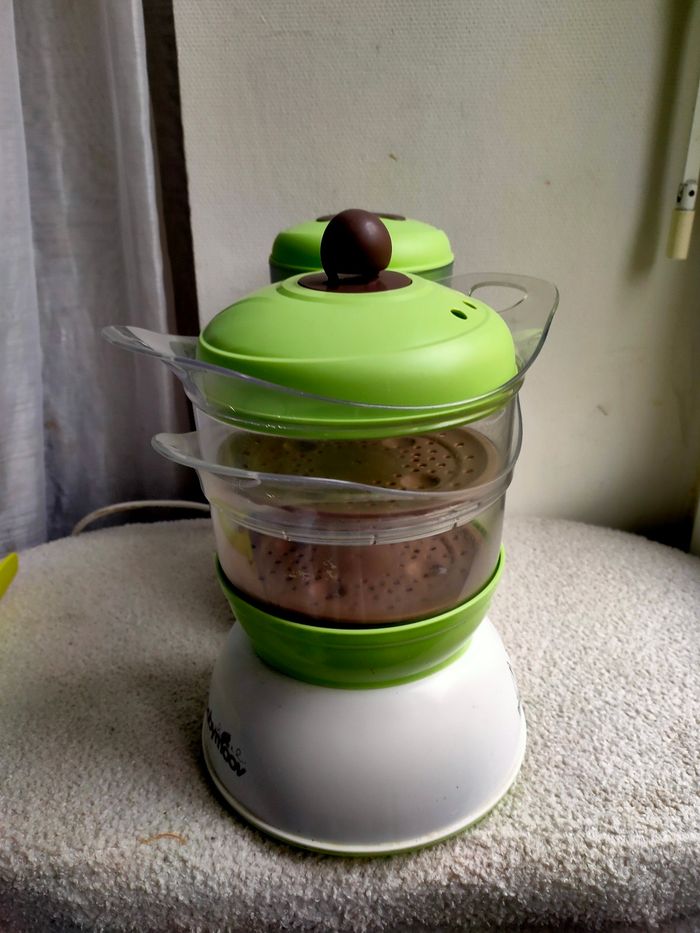 robot préparateur culinaire multifonctions, pour cuisiner de vrais plats pour bébé : compotes, purées. Il cumule 5 fonctions :  chauffe et stérilise jusqu'à 3 biberons, réchauffe les petits pots, cuit à la vapeur, décongèle et mixe les aliments. Il a été utilisé pour 1 bébé pour préparer des purée et compote en début de diversification alimentaire (quand je préparerai en petite quantité), il a quelques traces (rayures sur les plastiques transparent), hormis ce défaut il est en très bon état, un détartrage a été fait pour la vente, il est propre et attends sagement de reprendre du service. Il fonctionne parfaitement, sera vendu sans la notice car elle a été égaré, elle est facilement retrouva le sur le net.