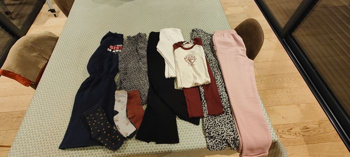 Lot de vêtements en très bon état, marque KIABI, TAPE À L'OEIL, GEMO, H&M Le jogging est noté 7 ans mais il est aussi long que le legging noir qui est en 8 ans. Je peux vous fournir d'autres photos si vous le souhaitez.