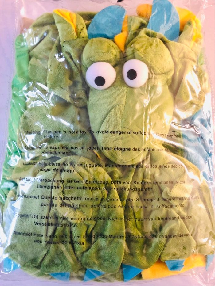 Je vends un déguisement de dinosaure, trois pièces, neuf. Combinaison, cagoule et pieds. Taille 92.