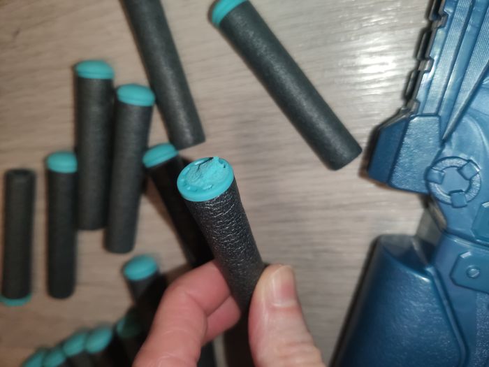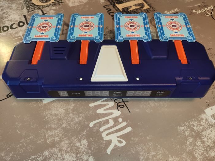 Cible tir électronique (plusieurs modes de jeux, la cible peut rester fixe sur place ou se déplacer de gauche à droite), compteur automatique, sons, etc. Le mode d'emploi est fourni. Dans le compartiment piles, un ressort est légèrement tordu donc il faut juste faire un peu plus attention en insérant la pile. 3 pistolets (2 Nerfs officiels + 1 Zuru Xshot) Le pistolet Nerf Strongarm a beaucoup plus servi, il se bloque un peu par moments mais peut encore être utilisé. Les autres sont nickels. 16 cartouches en mousse (1 a un embout abîmé mais peut encore être utilisée) Piles non fournies #tir #cible #electronique #nerf #pistolet