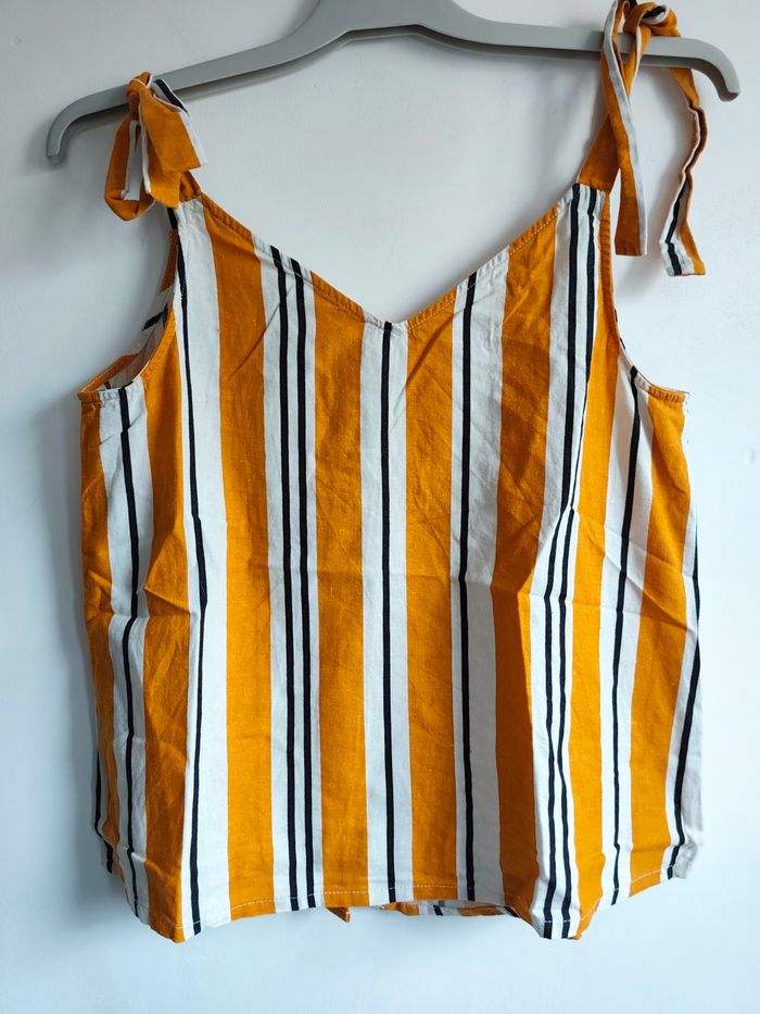 Top féminin à bretelles fines, coupe droite et légèrement ample. Modèle rayé vertical blanc, noir et jaune moutarde, très lumineux et facile à assortir. Boutonnage sur le devant avec boutons effet bois. Bretelles réglables à nouer sur les épaules, ce qui permet d’ajuster facilement le tombé. Matière légère et agréable à porter, idéale pour la belle saison. Peut se porter seul ou sous une veste légère. #femmevale62100 #hautvale62100 #tailleMvale62100 #promod #top #debardeur #topM #debardeurM